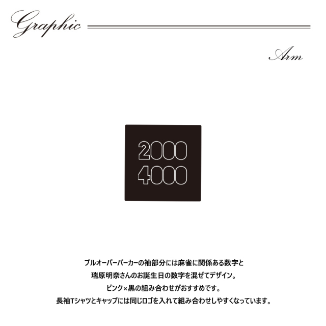 | 商品Data | 瑞原明奈さんとのコラボ企画! 今回のコラボはプルオーバーパーカーと長袖Tシャツ、キャップをリリース。 【デザイン】 プルオーバーパーカーの袖部分には麻雀に関係ある数字と瑞原明奈さんのお誕生日の数字を混ぜてデザイン。 ピンク×黒の組み合わせがおすすめです。 長袖Tシャツとキャップには同じロゴを入れて組み合わせしやすくなっています。 お使い頂けるシーズンを増やせるよう 程よい厚みとなっており、 春や秋にはメインアイテムとして 冬にはアウターのインナーアイテムとしてお使い頂けます。 ここでしか手に入らない受注期間限定アイテムです!是非お買い求めください!!! ※商品の発送予定時期は 【10月上旬頃~11月下旬頃順次発送予定】となります。 ※受注生産の為、発送予定時期が前後する場合がございます。 ※商品代金が10万円以上にて代引き決済を利用してのご注文につきましては、 トラブル防止のため、決済方法をクレジットカード決済もしくはコンビニ決済に変更 させていただく場合がございます。変更前にお電話、メールにてご連絡をさせていただきます。※ ※商品によっては撮影時にサンプルを使用しているため若干仕様が異なる場合がございます。 また、サイズ・カラーによっては仕様が異なる場合もございます。 ※手作業で縫製をしているため縫製の仕様により、 個体差が生じてしまいますので、1~2cm程度の誤差は予めご了承くださいませ。 ※洗濯機を使用した場合、お届け時のサイズより多少縮む場合がございます。 洗濯機を使用する場合は裏返してネットに入れることを推奨しております。 また、タンブラー乾燥機を使用しますとプリントが剥がれる恐れがありますので 避けていただきますようお願いいたします。 また、洗濯時の液温は40度以下とし、 塩素系および酸素系漂白剤の使用は避けていただきますようお願いいたします。 アイロンにつきましてもプリント及び刺繍部分は避け、 生地部分にアイロンをかける場合にはあて布をして110度(低温)にてお願いいたします。 ※また、受注生産とさせていただいておりますが、 各色・サイズ毎に生産数に限りがございます為、 生産数の上限に達しました場合在庫切れとなる場合がございます。 予めご了承頂けますようお願い致します。 |