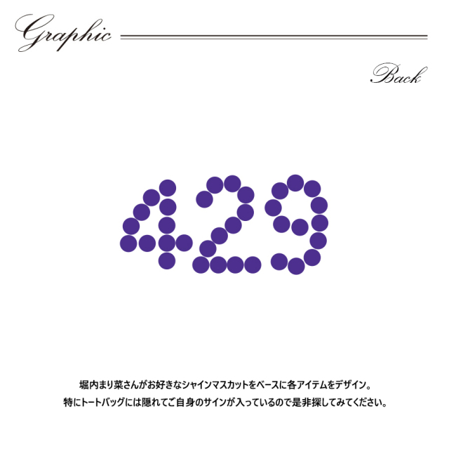 | 商品Data | 堀内まり菜さんとのコラボ企画! 今回のコラボはバケットハットとトートバッグ、プルオーバーパーカーをリリース。 【デザイン】 堀内まり菜さんがお好きなシャインマスカットをベースに各アイテムをデザイン。 特にトートバッグには隠れてご自身のサインが入っているので是非探してみてください。 お使い頂けるシーズンを増やせるよう 程よい厚みとなっており、 春や秋にはメインアイテムとして 冬にはアウターのインナーアイテムとしてお使い頂けます。 ここでしか手に入らない受注期間限定アイテムです!是非お買い求めください!!! ※商品の発送予定時期は 【10月中旬頃~12月中旬頃順次発送予定】となります。 ※受注生産の為、発送予定時期が前後する場合がございます。 ※商品代金が10万円以上にて代引き決済を利用してのご注文につきましては、 トラブル防止のため、決済方法をクレジットカード決済もしくはコンビニ決済に変更 させていただく場合がございます。変更前にお電話、メールにてご連絡をさせていただきます。※ ※商品によっては撮影時にサンプルを使用しているため若干仕様が異なる場合がございます。 また、サイズ・カラーによっては仕様が異なる場合もございます。 ※手作業で縫製をしているため縫製の仕様により、 個体差が生じてしまいますので、1~2cm程度の誤差は予めご了承くださいませ。 ※洗濯機を使用した場合、お届け時のサイズより多少縮む場合がございます。 洗濯機を使用する場合は裏返してネットに入れることを推奨しております。 また、タンブラー乾燥機を使用しますとプリントが剥がれる恐れがありますので 避けていただきますようお願いいたします。 また、洗濯時の液温は40度以下とし、 塩素系および酸素系漂白剤の使用は避けていただきますようお願いいたします。 アイロンにつきましてもプリント及び刺繍部分は避け、 生地部分にアイロンをかける場合にはあて布をして110度(低温)にてお願いいたします。 ※また、受注生産とさせていただいておりますが、 各色・サイズ毎に生産数に限りがございます為、 生産数の上限に達しました場合在庫切れとなる場合がございます。 予めご了承頂けますようお願い致します。 |