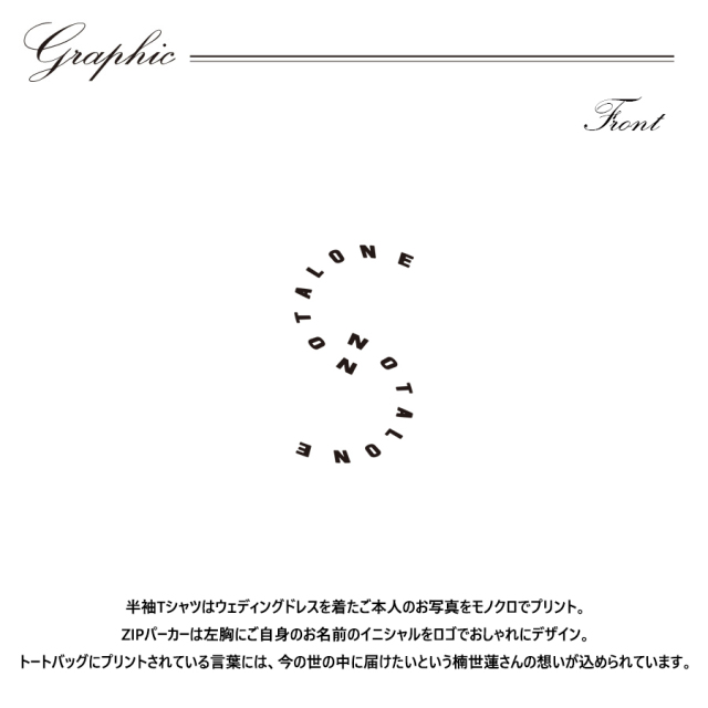 | 商品Data | 楠世蓮さんとのコラボ企画! 今回のコラボは半袖TシャツとZIPパーカー、トートバッグをリリース 【デザイン】 半袖Tシャツはウェディングドレスを着たご本人のお写真をモノクロでプリント。 ZIPパーカーは左胸にご自身のお名前のイニシャルをロゴでおしゃれにデザイン。 トートバッグにプリントされている言葉には、今の世の中に届けたいという楠世蓮さんの想いが込められています。 お使い頂けるシーズンを増やせるよう 程よい厚みとなっており、 春や秋にはメインアイテムとして 冬にはアウターのインナーアイテムとしてお使い頂けます。 ここでしか手に入らない受注期間限定アイテムです!是非お買い求めください!!! ※商品の発送予定時期は 【10月下旬頃~12月上旬頃順次発送予定】となります。 ※受注生産の為、発送予定時期が前後する場合がございます。 ※商品代金が10万円以上にて代引き決済を利用してのご注文につきましては、 トラブル防止のため、決済方法をクレジットカード決済もしくはコンビニ決済に変更 させていただく場合がございます。変更前にお電話、メールにてご連絡をさせていただきます。※ ※商品によっては撮影時にサンプルを使用しているため若干仕様が異なる場合がございます。 また、サイズ・カラーによっては仕様が異なる場合もございます。 ※手作業で縫製をしているため縫製の仕様により、 個体差が生じてしまいますので、1~2cm程度の誤差は予めご了承くださいませ。 ※洗濯機を使用した場合、お届け時のサイズより多少縮む場合がございます。 また、乾燥機の使用は避けていただきますようお願いいたします。 ※また、受注生産とさせていただいておりますが、 各色・サイズ毎に生産数に限りがございます為、 生産数の上限に達しました場合在庫切れとなる場合がございます。 |