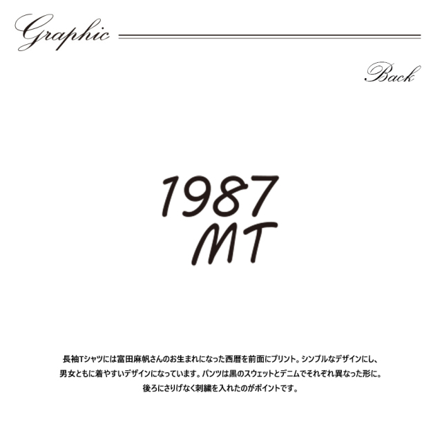 | 商品Data | 富田麻帆さんとのコラボ企画第5弾! 今回のコラボは長袖Tシャツと2タイプのスウェットパンツをリリース。 【デザイン】 長袖Tシャツには富田麻帆さんのお生まれになった西暦を前面にプリント。シンプルなデザインにし、 男女ともに着やすいデザインになっています。パンツは黒のスウェットとデニムでそれぞれ異なった形に。 後ろにさりげなく刺繍を入れたのがポイントです。 【ポイント】 ・後ろ側にオリジナル刺繍を入れ、ヴィンテージ風加工を施しています。 ・ウエストや裾はリブ仕様となっており、履きやすく作りました。 お使い頂けるシーズンを増やせるよう 程よい厚みとなっており、 春や秋にはメインアイテムとして 冬にはアウターのインナーアイテムとしてお使い頂けます。 ここでしか手に入らない受注期間限定アイテムです!是非お買い求めください!!! ※商品の発送予定時期は 【4月上旬頃~4月中旬頃順次発送予定】となります。 ※受注生産の為、発送予定時期が前後する場合がございます。 ※商品代金が10万円以上にて代引き決済を利用してのご注文につきましては、 トラブル防止のため、決済方法をクレジットカード決済もしくはコンビニ決済に変更 させていただく場合がございます。変更前にお電話、メールにてご連絡をさせていただきます。※ ※商品によっては撮影時にサンプルを使用しているため若干仕様が異なる場合がございます。 また、サイズ・カラーによっては仕様が異なる場合もございます。 ※手作業で縫製をしているため縫製の仕様により、 個体差が生じてしまいますので、1~2cm程度の誤差は予めご了承くださいませ。 ※洗濯機を使用した場合、お届け時のサイズより多少縮む場合がございます。 洗濯機を使用する場合は裏返してネットに入れることを推奨しております。 また、タンブラー乾燥機を使用しますとプリントが剥がれる恐れがありますので 避けていただきますようお願いいたします。 また、洗濯時の液温は40度以下とし、 塩素系および酸素系漂白剤の使用は避けていただきますようお願いいたします。 アイロンにつきましてもプリント及び刺繍部分は避け、 生地部分にアイロンをかける場合にはあて布をして110度(低温)にてお願いいたします。 ※また、受注生産とさせていただいておりますが、 各色・サイズ毎に生産数に限りがございます為、 生産数の上限に達しました場合在庫切れとなる場合がございます。 予めご了承頂けますようお願い致します。 |