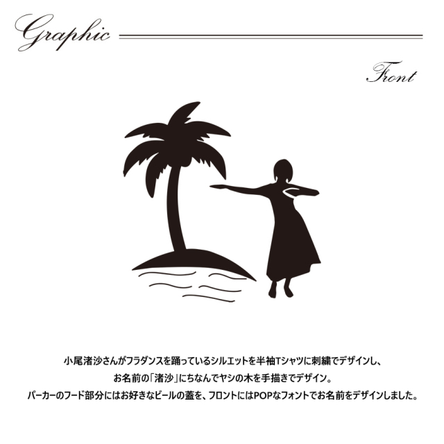 | 商品Data | 小尾渚沙さんとのコラボ企画! 今回のコラボは半袖Tシャツとプルオーバーパーカーをリリース。 【デザイン】 小尾渚沙さんがフラダンスを踊っているシルエットを半袖Tシャツに刺繍でデザインし、 お名前の「渚沙」にちなんでヤシの木を手描きでデザイン。 パーカーのフード部分にはお好きなビールの蓋を、フロントにはPOPなフォントでお名前をデザインしました。 お使い頂けるシーズンを増やせるよう 程よい厚みとなっており、 春や秋にはメインアイテムとして 冬にはアウターのインナーアイテムとしてお使い頂けます。 ここでしか手に入らない受注期間限定アイテムです!是非お買い求めください!!! ※商品の発送予定時期は 【6月下旬頃~8月中旬頃順次発送予定】となります。 ※受注生産の為、発送予定時期が前後する場合がございます。 ※商品代金が10万円以上にて代引き決済を利用してのご注文につきましては、 トラブル防止のため、決済方法をクレジットカード決済もしくはコンビニ決済に変更 させていただく場合がございます。変更前にお電話、メールにてご連絡をさせていただきます。※ ※商品によっては撮影時にサンプルを使用しているため若干仕様が異なる場合がございます。 また、サイズ・カラーによっては仕様が異なる場合もございます。 ※手作業で縫製をしているため縫製の仕様により、 個体差が生じてしまいますので、1~2cm程度の誤差は予めご了承くださいませ。 ※洗濯機を使用した場合、お届け時のサイズより多少縮む場合がございます。 洗濯機を使用する場合は裏返してネットに入れることを推奨しております。 また、タンブラー乾燥機を使用しますとプリントが剥がれる恐れがありますので 避けていただきますようお願いいたします。 また、洗濯時の液温は40度以下とし、 塩素系および酸素系漂白剤の使用は避けていただきますようお願いいたします。 アイロンにつきましてもプリント及び刺繍部分は避け、 生地部分にアイロンをかける場合にはあて布をして110度(低温)にてお願いいたします。 ※また、受注生産とさせていただいておりますが、 各色・サイズ毎に生産数に限りがございます為、 生産数の上限に達しました場合在庫切れとなる場合がございます。 予めご了承頂けますようお願い致します。 |