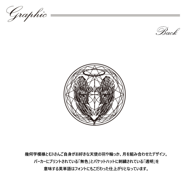 | 商品Data | むトさんとのコラボ企画! 今回のコラボはZIPパーカーとプルオーバーパーカー、バケットハットをリリース。 【デザイン】 幾何学模様とむトさんご自身がお好きな天使の羽や輪っか、月を組み合わせたデザイン。 パーカーにプリントされている「無色」とバケットハットに刺繍されている「透明」を 意味する英単語はフォントにもこだわった仕上がりとなっています。 ここでしか手に入らない受注期間限定アイテムです!是非お買い求めください!!! ※商品の発送予定時期は 【11月上旬頃~11月下旬頃順次発送予定】となります。 ※受注生産の為、発送予定時期が前後する場合がございます。 ※高額注文の場合には ご注文後にお電話にてご連絡をさせていただく場合がございます。 お電話にてご連絡が取れない場合にはメールにてご連絡させていただき、 ご連絡日より3日以内にご返信をいただけない場合には不正注文の可能性があると判断し トラブル防止のためご注文をキャンセルとさせていただきます。 ※商品によっては撮影時にサンプルを使用しているため若干仕様が異なる場合がございます。 また、サイズ・カラーによっては仕様が異なる場合もございます。 ※手作業で縫製をしているため縫製の仕様により、 個体差が生じてしまいますので、1~2cm程度の誤差は予めご了承くださいませ。 ※洗濯機を使用した場合、お届け時のサイズより多少縮む場合がございます。 洗濯機を使用する場合は裏返してネットに入れることを推奨しております。 また、タンブラー乾燥機を使用しますとプリントが剥がれる恐れがありますので 避けていただきますようお願いいたします。 また、洗濯時の液温は40度以下とし、 塩素系および酸素系漂白剤の使用は避けていただきますようお願いいたします。 アイロンにつきましてもプリント及び刺繍部分は避け、 生地部分にアイロンをかける場合にはあて布をして110度(低温)にてお願いいたします。 ※また、受注生産とさせていただいておりますが、 各色・サイズ毎に生産数に限りがございます為、 生産数の上限に達しました場合在庫切れとなる場合がございます。 |