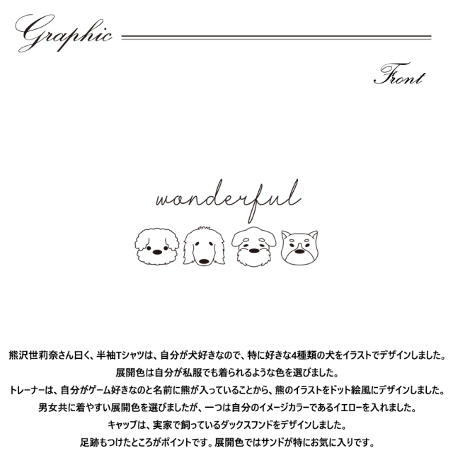 | 商品Data | 熊沢世莉奈さんとのコラボ企画 今回のコラボは半袖Tシャツとトレーナー、キャップをリリース。 【デザイン】 熊沢世莉奈さん曰く、半袖Tシャツは、自分が犬好きなので、特に好きな4種類の犬をイラストでデザインしました。 展開色は自分が私服でも着られるような色を選びました。 トレーナーは、自分がゲーム好きなのと名前に熊が入っていることから、熊のイラストをドット絵風にデザインしました。 男女共に着やすい展開色を選びましたが、一つは自分のイメージカラーであるイエローを入れました。 キャップは、実家で飼っているダックスフンドをデザインしました。 足跡もつけたところがポイントです。展開色ではサンドが特にお気に入りです。 ここでしか手に入らない受注期間限定アイテムです!是非お買い求めください!!! ※商品の発送予定時期は 【9月下旬頃~10月上旬頃順次発送予定】となります。 ※受注生産の為、発送予定時期が前後する場合がございます。 ※高額注文の場合には ご注文後にお電話にてご連絡をさせていただく場合がございます。 お電話にてご連絡が取れない場合にはメールにてご連絡させていただき、 ご連絡日より3日以内にご返信をいただけない場合には不正注文の可能性があると判断し トラブル防止のためご注文をキャンセルとさせていただきます。 ※商品によっては撮影時にサンプルを使用しているため若干仕様が異なる場合がございます。 また、サイズ・カラーによっては仕様が異なる場合もございます。 ※手作業で縫製をしているため縫製の仕様により、 個体差が生じてしまいますので、1~2cm程度の誤差は予めご了承くださいませ。 ※洗濯機を使用した場合、お届け時のサイズより多少縮む場合がございます。 洗濯機を使用する場合は裏返してネットに入れることを推奨しております。 また、タンブラー乾燥機を使用しますとプリントが剥がれる恐れがありますので 避けていただきますようお願いいたします。 また、洗濯時の液温は40度以下とし、 塩素系および酸素系漂白剤の使用は避けていただきますようお願いいたします。 アイロンにつきましてもプリント及び刺繍部分は避け、 生地部分にアイロンをかける場合にはあて布をして110度(低温)にてお願いいたします。 ※また、受注生産とさせていただいておりますが、 各色・サイズ毎に生産数に限りがございます為、 生産数の上限に達しました場合在庫切れとなる場合がございます。 |