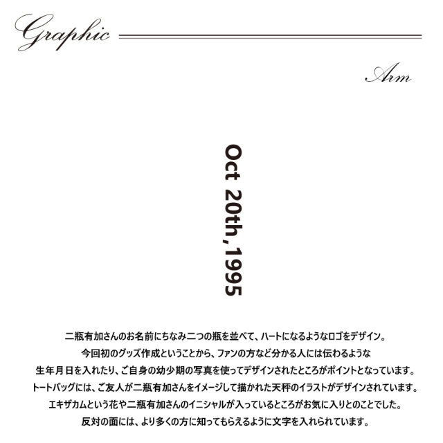 | 商品Data | 二瓶有加さんとのコラボ企画! 今回のコラボは長袖Tシャツ、プルオーバーパーカー、クッション、トートバッグをリリース。 【デザイン】 二瓶有加さんのお名前にちなみ二つの瓶を並べて、ハートになるようなロゴをデザイン。 今回初のグッズ作成ということから、ファンの方など分かる人には伝わるような 生年月日を入れたり、ご自身の幼少期の写真を使ってデザインされたところがポイントとなっています。 トートバッグには、ご友人が二瓶有加さんをイメージして描かれた天秤のイラストがデザインされています。 エキザカムという花や二瓶有加さんのイニシャルが入っているところがお気に入りとのことでした。 反対の面には、より多くの方に知ってもらえるように文字を入れられています。 ここでしか手に入らない受注期間限定アイテムです!是非お買い求めください!!! ※商品の発送予定時期は 【11月中旬頃~12月中旬頃順次発送予定】となります。 ※受注生産の為、発送予定時期が前後する場合がございます。 ※高額注文の場合には ご注文後にお電話にてご連絡をさせていただく場合がございます。 お電話にてご連絡が取れない場合にはメールにてご連絡させていただき、 ご連絡日より3日以内にご返信をいただけない場合には不正注文の可能性があると判断し トラブル防止のためご注文をキャンセルとさせていただきます。 ※商品によっては撮影時にサンプルを使用しているため若干仕様が異なる場合がございます。 また、サイズ・カラーによっては仕様が異なる場合もございます。 ※手作業で縫製をしているため縫製の仕様により、 個体差が生じてしまいますので、1~2cm程度の誤差は予めご了承くださいませ。 ※洗濯機を使用した場合、お届け時のサイズより多少縮む場合がございます。 洗濯機を使用する場合は裏返してネットに入れることを推奨しております。 また、タンブラー乾燥機を使用しますとプリントが剥がれる恐れがありますので 避けていただきますようお願いいたします。 また、洗濯時の液温は40度以下とし、 塩素系および酸素系漂白剤の使用は避けていただきますようお願いいたします。 アイロンにつきましてもプリント及び刺繍部分は避け、 生地部分にアイロンをかける場合にはあて布をして110度(低温)にてお願いいたします。 ※また、受注生産とさせていただいておりますが、 各色・サイズ毎に生産数に限りがございます為、 生産数の上限に達しました場合在庫切れとなる場合がございます。 |