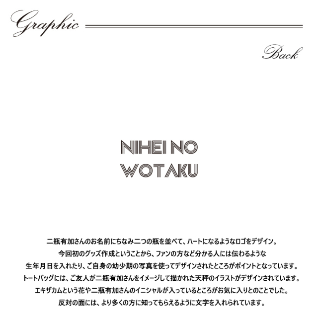 | 商品Data | 二瓶有加さんとのコラボ企画! 今回のコラボは長袖Tシャツ、プルオーバーパーカー、クッション、トートバッグをリリース。 【デザイン】 二瓶有加さんのお名前にちなみ二つの瓶を並べて、ハートになるようなロゴをデザイン。 今回初のグッズ作成ということから、ファンの方など分かる人には伝わるような 生年月日を入れたり、ご自身の幼少期の写真を使ってデザインされたところがポイントとなっています。 トートバッグには、ご友人が二瓶有加さんをイメージして描かれた天秤のイラストがデザインされています。 エキザカムという花や二瓶有加さんのイニシャルが入っているところがお気に入りとのことでした。 反対の面には、より多くの方に知ってもらえるように文字を入れられています。 ここでしか手に入らない受注期間限定アイテムです!是非お買い求めください!!! ※商品の発送予定時期は 【11月中旬頃~12月中旬頃順次発送予定】となります。 ※受注生産の為、発送予定時期が前後する場合がございます。 ※高額注文の場合には ご注文後にお電話にてご連絡をさせていただく場合がございます。 お電話にてご連絡が取れない場合にはメールにてご連絡させていただき、 ご連絡日より3日以内にご返信をいただけない場合には不正注文の可能性があると判断し トラブル防止のためご注文をキャンセルとさせていただきます。 ※商品によっては撮影時にサンプルを使用しているため若干仕様が異なる場合がございます。 また、サイズ・カラーによっては仕様が異なる場合もございます。 ※手作業で縫製をしているため縫製の仕様により、 個体差が生じてしまいますので、1~2cm程度の誤差は予めご了承くださいませ。 ※洗濯機を使用した場合、お届け時のサイズより多少縮む場合がございます。 洗濯機を使用する場合は裏返してネットに入れることを推奨しております。 また、タンブラー乾燥機を使用しますとプリントが剥がれる恐れがありますので 避けていただきますようお願いいたします。 また、洗濯時の液温は40度以下とし、 塩素系および酸素系漂白剤の使用は避けていただきますようお願いいたします。 アイロンにつきましてもプリント及び刺繍部分は避け、 生地部分にアイロンをかける場合にはあて布をして110度(低温)にてお願いいたします。 ※また、受注生産とさせていただいておりますが、 各色・サイズ毎に生産数に限りがございます為、 生産数の上限に達しました場合在庫切れとなる場合がございます。 |