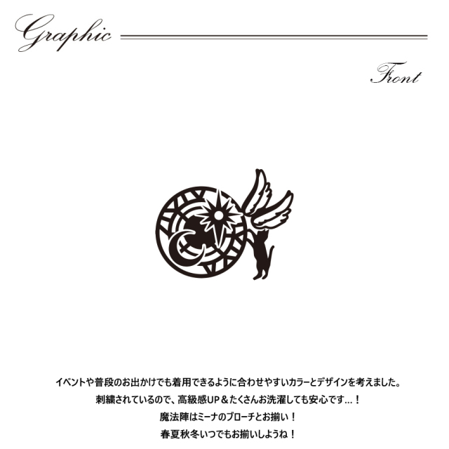 | 商品Data | 桜鳥ミーナさんとのコラボ企画! 今回のコラボは半袖Tシャツ、プルオーバーパーカー、トートバッグをリリース。 【デザイン】 イベントや普段のお出かけでも着用できるように合わせやすいカラーとデザインを考えました。 刺繍されているので、高級感UP&たくさんお洗濯しても安心です…! 魔法陣はミーナのブローチとお揃い! 春夏秋冬いつでもお揃いしようね! ここでしか手に入らない受注期間限定アイテムです!是非お買い求めください!!! ※商品の発送予定時期は 【3月中旬頃~3月下旬頃順次発送予定】となります。 ※OLIVEのカラーにつきましては【4月下旬頃~5月上旬頃順次発送予定】BLACKのカラーは【5月下旬頃~6月上旬頃順次発送予定】となります。 ※受注生産の為、発送予定時期が前後する場合がございます。 ※高額注文の場合には ご注文後にお電話にてご連絡をさせていただく場合がございます。 お電話にてご連絡が取れない場合にはメールにてご連絡させていただき、 ご連絡日より3日以内にご返信をいただけない場合には不正注文の可能性があると判断し トラブル防止のためご注文をキャンセルとさせていただきます。 ※商品によっては撮影時にサンプルを使用しているため若干仕様が異なる場合がございます。 また、サイズ・カラーによっては仕様が異なる場合もございます。 ※手作業で縫製をしているため縫製の仕様により、 個体差が生じてしまいますので、1~2cm程度の誤差は予めご了承くださいませ。 ※洗濯機を使用した場合、お届け時のサイズより多少縮む場合がございます。 洗濯機を使用する場合は裏返してネットに入れることを推奨しております。 また、タンブラー乾燥機を使用しますとプリントが剥がれる恐れがありますので 避けていただきますようお願いいたします。 また、洗濯時の液温は40度以下とし、 塩素系および酸素系漂白剤の使用は避けていただきますようお願いいたします。 アイロンにつきましてもプリント及び刺繍部分は避け、 生地部分にアイロンをかける場合にはあて布をして110度(低温)にてお願いいたします。 ※また、受注生産とさせていただいておりますが、 各色・サイズ毎に生産数に限りがございます為、 生産数の上限に達しました場合在庫切れとなる場合がございます。 |