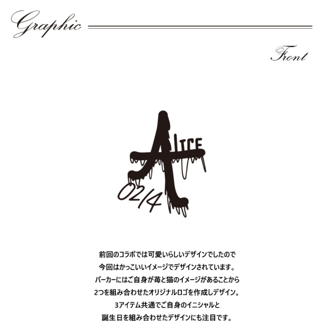 | 商品Data | 寺沢ありすさんとのコラボ企画第2弾! 今回のコラボはZIPパーカーとキャップ、ネックレスをリリース。 【デザイン】 前回のコラボでは可愛いらしいデザインでしたので今回はかっこいいイメージで デザインされています。 パーカーにはご自身が苺と猫のイメージがあることから2つを組み合わせた オリジナルロゴを作成しデザイン。 3アイテム共通でご自身のイニシャルと誕生日を組み合わせたデザインにも注目です。 ここでしか手に入らない受注期間限定アイテムです!是非お買い求めください!!! ※商品の発送予定時期は 【2月中旬頃~2月下旬頃順次発送予定】となります。 ※受注生産の為、発送予定時期が前後する場合がございます。 ※高額注文の場合には ご注文後にお電話にてご連絡をさせていただく場合がございます。 お電話にてご連絡が取れない場合にはメールにてご連絡させていただき、 ご連絡日より3日以内にご返信をいただけない場合には不正注文の可能性があると判断し トラブル防止のためご注文をキャンセルとさせていただきます。 ※商品によっては撮影時にサンプルを使用しているため若干仕様が異なる場合がございます。 また、サイズ・カラーによっては仕様が異なる場合もございます。 ※手作業で縫製をしているため縫製の仕様により、 個体差が生じてしまいますので、1~2cm程度の誤差は予めご了承くださいませ。 ※洗濯機を使用した場合、お届け時のサイズより多少縮む場合がございます。 洗濯機を使用する場合は裏返してネットに入れることを推奨しております。 また、タンブラー乾燥機を使用しますとプリントが剥がれる恐れがありますので 避けていただきますようお願いいたします。 また、洗濯時の液温は40度以下とし、 塩素系および酸素系漂白剤の使用は避けていただきますようお願いいたします。 アイロンにつきましてもプリント及び刺繍部分は避け、 生地部分にアイロンをかける場合にはあて布をして110度(低温)にてお願いいたします。 ※また、受注生産とさせていただいておりますが、 各色・サイズ毎に生産数に限りがございます為、 生産数の上限に達しました場合在庫切れとなる場合がございます。 |