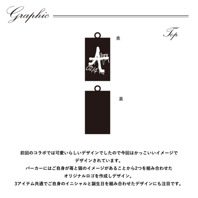 | 商品Data | 寺沢ありすさんとのコラボ企画第2弾! 今回のコラボはZIPパーカーとキャップ、ネックレスをリリース。 【デザイン】 前回のコラボでは可愛いらしいデザインでしたので今回はかっこいいイメージで デザインされています。 パーカーにはご自身が苺と猫のイメージがあることから2つを組み合わせた オリジナルロゴを作成しデザイン。 3アイテム共通でご自身のイニシャルと誕生日を組み合わせたデザインにも注目です。 メッキ加工:国内加工 原型作成:国内 ※アレルギーの反応等がその時の体調や個人差により出る場合がございますので、 金属製アクセサリーを初めてご使用の場合は必ず「パッチテスト」をしてご使用ください。※ 【パッチテストとは】 金属アレルギーの場合、特殊なテープに24種類の金属試薬をつけてアレルギーの有無を調べる検査です。 皮膚科などで相談をすれば身近にできる検査です。 いくつか検査中に注意する点がありますのでテストを受ける病院で検査について相談してください。 ※現時点での商品の発送予定時期は【2月中旬頃~2月下旬頃順次発送予定】を予定しております。 ※受注生産の為、発送予定時期が前後する場合がございます。 ※高額注文の場合には ご注文後にお電話にてご連絡をさせていただく場合がございます。 お電話にてご連絡が取れない場合にはメールにてご連絡させていただき、 ご連絡日より3日以内にご返信をいただけない場合には不正注文の可能性があると判断し トラブル防止のためご注文をキャンセルとさせていただきます。 また、受注生産とさせていただいておりますが、 各色・サイズ毎に生産数を設けさせて頂いております為、 生産数の上限に達しました場合在庫切れとなる場合がございます。 ※※商品画像は照明などの影響により実際の色と異なる場合がございます ※加工の特性上、仕上がり寸法及び色のニュアンスが多少異なることがあります。 |