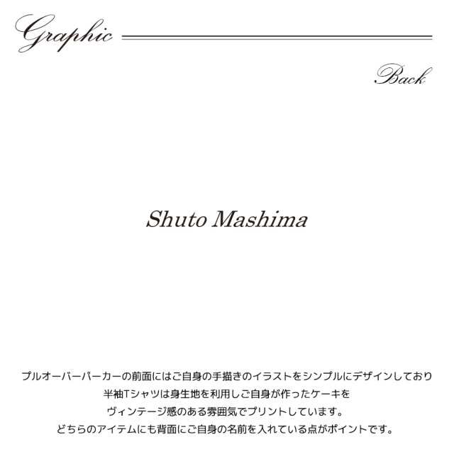 | 商品Data | 眞嶋秀斗さんとのコラボ企画! 今回のコラボは半袖Tシャツ、プルオーバーパーカーをリリース。 【デザイン】 プルオーバーパーカーの前面にはご自身の手描きのイラストをシンプルにデザインしており 半袖Tシャツは身生地を利用しご自身が作ったケーキをヴィンテージ感のある雰囲気でプリントしています。 どちらのアイテムにも背面にご自身の名前を入れている点がポイントです。 ※商品の発送予定時期は【3月中旬頃~3月下旬頃順次発送予定】となります。 ※受注生産の為、発送予定時期が前後する場合がございます。 ※高額注文の場合には ご注文後にお電話にてご連絡をさせていただく場合がございます。 お電話にてご連絡が取れない場合にはメールにてご連絡させていただき、 ご連絡日より3日以内にご返信をいただけない場合には不正注文の可能性があると判断し トラブル防止のためご注文をキャンセルとさせていただきます。 ※商品によっては撮影時にサンプルを使用しているため若干仕様が異なる場合がございます。 また、サイズ・カラーによっては仕様が異なる場合もございます。 ※手作業で縫製をしているため縫製の仕様により、 個体差が生じてしまいますので、1~2cm程度の誤差は予めご了承くださいませ。 ※洗濯機を使用した場合、お届け時のサイズより多少縮む場合がございます。 洗濯機を使用する場合は裏返してネットに入れることを推奨しております。 また、タンブラー乾燥機を使用しますとプリントが剥がれる恐れがありますので 避けていただきますようお願いいたします。 また、洗濯時の液温は40度以下とし、 塩素系および酸素系漂白剤の使用は避けていただきますようお願いいたします。 アイロンにつきましてもプリント及び刺繍部分は避け、 生地部分にアイロンをかける場合にはあて布をして110度(低温)にてお願いいたします。 ※また、受注生産とさせていただいておりますが、 各色・サイズ毎に生産数に限りがございます為、 生産数の上限に達しました場合在庫切れとなる場合がございます。 |