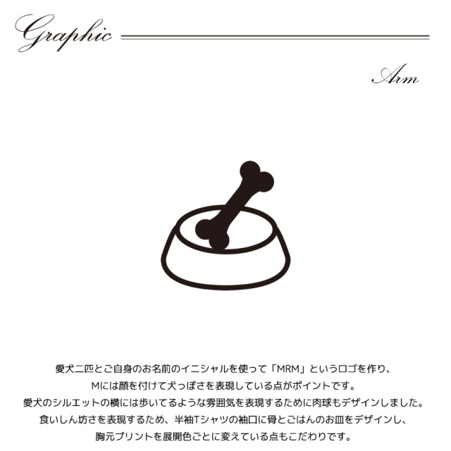 | 商品Data | 衣川里佳さんとのコラボ企画! 今回のコラボは半袖Tシャツ、ZIPパーカー、キャップをリリース。 【デザイン】 愛犬二匹とご自身のお名前のイニシャルを使って「MRM」というロゴを作り、 Mには顔を付けて犬っぽさを表現している点がポイントです。 愛犬のシルエットの横には歩いてるような雰囲気を表現するために肉球もデザインしました。 食いしん坊さを表現するため、半袖Tシャツの袖口に骨とごはんのお皿をデザインし、 胸元プリントを展開色ごとに変えている点もこだわりです。 ※商品の発送予定時期は【6月上旬頃~6月中旬頃順次発送予定】となります。 ※受注生産の為、発送予定時期が前後する場合がございます。 ※高額注文の場合には ご注文後にお電話にてご連絡をさせていただく場合がございます。 お電話にてご連絡が取れない場合にはメールにてご連絡させていただき、 ご連絡日より3日以内にご返信をいただけない場合には不正注文の可能性があると判断し トラブル防止のためご注文をキャンセルとさせていただきます。 ※商品によっては撮影時にサンプルを使用しているため若干仕様が異なる場合がございます。 また、サイズ・カラーによっては仕様が異なる場合もございます。 ※手作業で縫製をしているため縫製の仕様により、 個体差が生じてしまいますので、1~2cm程度の誤差は予めご了承くださいませ。 ※洗濯機を使用した場合、お届け時のサイズより多少縮む場合がございます。 洗濯機を使用する場合は裏返してネットに入れることを推奨しております。 また、タンブラー乾燥機を使用しますとプリントが剥がれる恐れがありますので 避けていただきますようお願いいたします。 また、洗濯時の液温は40度以下とし、 塩素系および酸素系漂白剤の使用は避けていただきますようお願いいたします。 アイロンにつきましてもプリント及び刺繍部分は避け、 生地部分にアイロンをかける場合にはあて布をして110度(低温)にてお願いいたします。 ※また、受注生産とさせていただいておりますが、 各色・サイズ毎に生産数に限りがございます為、 生産数の上限に達しました場合在庫切れとなる場合がございます。 |