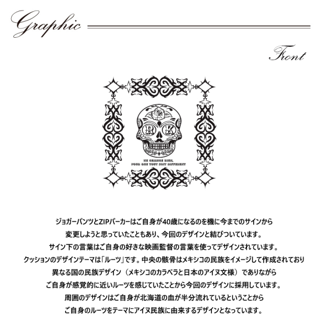| 商品Data | 河合龍之介さんとのコラボ企画! 今回のコラボはZIPパーカー、ジョガーパンツ、クッションをリリース。 【デザイン】 ジョガーパンツとZIPパーカーは ご自身が40歳になるのを機に今までのサインから変更しようと思っていたこともあり、 今回のデザインと結びついています。 サイン下の言葉はご自身の好きな映画監督の言葉を使ってデザインされています。 クッションのデザインテーマは「ルーツ」です。 中央の骸骨はメキシコの民族をイメージして作成されており 異なる国の民族デザイン(メキシコのカラベラと日本のアイヌ文様)でありながら ご自身が感覚的に近いルーツを感じていたことから今回のデザインに採用しています。 周囲のデザインはご自身が北海道の血が半分流れているということからご自身のルーツを テーマにアイヌ民族に由来するデザインとなっています。 ここでしか手に入らない受注期間限定アイテムです!是非お買い求めください!!! ※商品の発送予定時期は 【6月中旬頃~6月下旬頃順次発送予定】となります。 ※受注生産の為、発送予定時期が前後する場合がございます。 ※高額注文の場合には ご注文後にお電話にてご連絡をさせていただく場合がございます。 お電話にてご連絡が取れない場合にはメールにてご連絡させていただき、 ご連絡日より3日以内にご返信をいただけない場合には不正注文の可能性があると判断し トラブル防止のためご注文をキャンセルとさせていただきます。 ※商品によっては撮影時にサンプルを使用しているため若干仕様が異なる場合がございます。 また、サイズ・カラーによっては仕様が異なる場合もございます。 ※手作業で縫製をしているため縫製の仕様により、 個体差が生じてしまいますので、1~2cm程度の誤差は予めご了承くださいませ。 ※洗濯機を使用した場合、お届け時のサイズより多少縮む場合がございます。 洗濯機を使用する場合は裏返してネットに入れることを推奨しております。 また、タンブラー乾燥機を使用しますとプリントが剥がれる恐れがありますので 避けていただきますようお願いいたします。 また、洗濯時の液温は40度以下とし、 塩素系および酸素系漂白剤の使用は避けていただきますようお願いいたします。 アイロンにつきましてもプリント及び刺繍部分は避け、 生地部分にアイロンをかける場合にはあて布をして110度(低温)にてお願いいたします。 ※また、受注生産とさせていただいておりますが、 各色・サイズ毎に生産数に限りがございます為、 生産数の上限に達しました場合在庫切れとなる場合がございます。 |