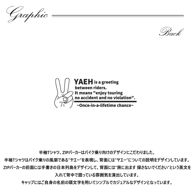 | 商品Data | hibiさんとのコラボ企画! 今回のコラボは半袖Tシャツ、ZIPパーカー、キャップをリリース。 【デザイン】 半袖Tシャツ、ZIPパーカーはバイク乗り向けのデザインにこだわりました。 半袖Tシャツはバイク乗りの風潮である”ヤエー”を表現し、背面には ”ヤエー”についての説明をデザインしています。 ZIPパーカーの前面には手書きの日本列島をデザインして、 背面には”旅に出ます 探さないでください”という英文を入れて 背中で語っている雰囲気を演出しています。 キャップにはご自身の名前の頭文字を用いてシンプルでカジュアルな デザインとなっています。 ここでしか手に入らない受注期間限定アイテムです!是非お買い求めください!!! ※商品の発送予定時期は【6月下旬頃~7月上旬頃順次発送予定】となります。 ※受注生産の為、発送予定時期が前後する場合がございます。 ※高額注文の場合には ご注文後にお電話にてご連絡をさせていただく場合がございます。 お電話にてご連絡が取れない場合にはメールにてご連絡させていただき、 ご連絡日より3日以内にご返信をいただけない場合には不正注文の可能性があると判断し トラブル防止のためご注文をキャンセルとさせていただきます。 ※商品によっては撮影時にサンプルを使用しているため若干仕様が異なる場合がございます。 また、サイズ・カラーによっては仕様が異なる場合もございます。 ※手作業で縫製をしているため縫製の仕様により、 個体差が生じてしまいますので、1~2cm程度の誤差は予めご了承くださいませ。 ※洗濯機を使用した場合、お届け時のサイズより多少縮む場合がございます。 洗濯機を使用する場合は裏返してネットに入れることを推奨しております。 また、タンブラー乾燥機を使用しますとプリントが剥がれる恐れがありますので 避けていただきますようお願いいたします。 また、洗濯時の液温は40度以下とし、 塩素系および酸素系漂白剤の使用は避けていただきますようお願いいたします。 アイロンにつきましてもプリント及び刺繍部分は避け、 生地部分にアイロンをかける場合にはあて布をして110度(低温)にてお願いいたします。 ※また、受注生産とさせていただいておりますが、 各色・サイズ毎に生産数に限りがございます為、 生産数の上限に達しました場合在庫切れとなる場合がございます。 |
