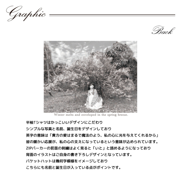 | 商品Data | 絃ユリナさんとのコラボ企画! 今回のコラボは半袖Tシャツ、ZIPパーカー、バケットハットをリリース。 【デザイン】 半袖Tシャツはかっこいいデザインにこだわり シンプルな写真と名前、誕生日をデザインしており 英字の意味は「貴方の愛はまるで魔法のよう、私の心に光を与えてくれるから」 皆の暖かい応援が、私の心の支えになっているという意味が込められています。 ZIPパーカーの前面の刺繍はよく見ると「いと」と読めるようになっており 背面のイラストはご自身の書き下ろしデザインとなっています。 バケットハットは幾何学模様をイメージしており こちらにも名前と誕生日が入っている点がポイントです。 ここでしか手に入らない受注期間限定アイテムです!是非お買い求めください!!! ※商品の発送予定時期は【7月下旬頃~8月上旬頃順次発送予定】となります。 ※受注生産の為、発送予定時期が前後する場合がございます。 ※高額注文の場合には ご注文後にお電話にてご連絡をさせていただく場合がございます。 お電話にてご連絡が取れない場合にはメールにてご連絡させていただき、 ご連絡日より3日以内にご返信をいただけない場合には不正注文の可能性があると判断し トラブル防止のためご注文をキャンセルとさせていただきます。 ※商品によっては撮影時にサンプルを使用しているため若干仕様が異なる場合がございます。 また、サイズ・カラーによっては仕様が異なる場合もございます。 ※手作業で縫製をしているため縫製の仕様により、 個体差が生じてしまいますので、1~2cm程度の誤差は予めご了承くださいませ。 ※洗濯機を使用した場合、お届け時のサイズより多少縮む場合がございます。 洗濯機を使用する場合は裏返してネットに入れることを推奨しております。 また、タンブラー乾燥機を使用しますとプリントが剥がれる恐れがありますので 避けていただきますようお願いいたします。 また、洗濯時の液温は40度以下とし、 塩素系および酸素系漂白剤の使用は避けていただきますようお願いいたします。 アイロンにつきましてもプリント及び刺繍部分は避け、 生地部分にアイロンをかける場合にはあて布をして110度(低温)にてお願いいたします。 ※また、受注生産とさせていただいておりますが、 各色・サイズ毎に生産数に限りがございます為、 生産数の上限に達しました場合在庫切れとなる場合がございます。 |