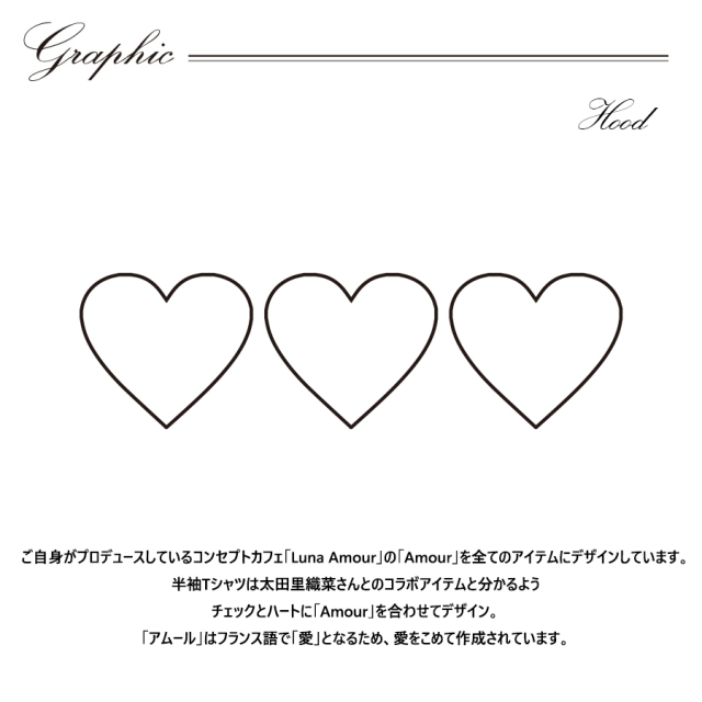 | 商品Data | 太田里織菜さんとのコラボ企画! 今回のコラボは半袖Tシャツ、ZIPパーカー、キャップをリリース。 【デザイン】 ご自身がプロデュースしているコンセプトカフェ「Luna Amour」の「Amour」を 全てのアイテムにデザインしています。 半袖Tシャツは太田里織菜さんとのコラボアイテムと分かるよう チェックとハートに「Amour」を合わせてデザイン。 「アムール」はフランス語で「愛」となるため、愛をこめて作成されています。 ここでしか手に入らない受注期間限定アイテムです!是非お買い求めください!!! ※商品の発送予定時期は【9月上旬頃~9月下旬頃順次発送予定】となります。 ※受注生産の為、発送予定時期が前後する場合がございます。 ※高額注文の場合には ご注文後にお電話にてご連絡をさせていただく場合がございます。 お電話にてご連絡が取れない場合にはメールにてご連絡させていただき、 ご連絡日より3日以内にご返信をいただけない場合には不正注文の可能性があると判断し トラブル防止のためご注文をキャンセルとさせていただきます。 ※商品によっては撮影時にサンプルを使用しているため若干仕様が異なる場合がございます。 また、サイズ・カラーによっては仕様が異なる場合もございます。 ※手作業で縫製をしているため縫製の仕様により、 個体差が生じてしまいますので、1~2cm程度の誤差は予めご了承くださいませ。 ※洗濯機を使用した場合、お届け時のサイズより多少縮む場合がございます。 洗濯機を使用する場合は裏返してネットに入れることを推奨しております。 また、タンブラー乾燥機を使用しますとプリントが剥がれる恐れがありますので 避けていただきますようお願いいたします。 また、洗濯時の液温は40度以下とし、 塩素系および酸素系漂白剤の使用は避けていただきますようお願いいたします。 アイロンにつきましてもプリント及び刺繍部分は避け、 生地部分にアイロンをかける場合にはあて布をして110度(低温)にてお願いいたします。 ※また、受注生産とさせていただいておりますが、 各色・サイズ毎に生産数に限りがございます為、 生産数の上限に達しました場合在庫切れとなる場合がございます。 |