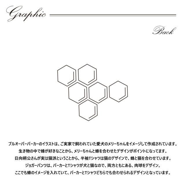 | 商品Data | 日向朔公さんとのコラボ企画! 今回のコラボは半袖Tシャツ、プルオーバーパーカー、ジョガーパンツをリリース。 【デザイン】 プルオーバーパーカーのイラストは、ご実家で飼われていた愛犬のメリーちゃんをイメージして作成されています。 生き物の中で蜂が好きなことから、メリーちゃんと蜂を合わせたデザインがポイントになってます。 日向朔公さんが実は猫派ということから、半袖Tシャツは猫のデザインで、蜂と猫を合わせています。 ジョガーパンツは、パーカーとTシャツが犬と猫なので、両方ともにある、肉球をデザイン。 ここでも蜂のイメージを入れていて、パーカーとTシャツどちらでも合わせられるデザインとなっています。 ここでしか手に入らない受注期間限定アイテムです!是非お買い求めください!!! ※商品の発送予定時期は【9月中旬頃~9月下旬頃順次発送予定】となります。 ※受注生産の為、発送予定時期が前後する場合がございます。 ※高額注文の場合には ご注文後にお電話にてご連絡をさせていただく場合がございます。 お電話にてご連絡が取れない場合にはメールにてご連絡させていただき、 ご連絡日より3日以内にご返信をいただけない場合には不正注文の可能性があると判断し トラブル防止のためご注文をキャンセルとさせていただきます。 ※商品によっては撮影時にサンプルを使用しているため若干仕様が異なる場合がございます。 また、サイズ・カラーによっては仕様が異なる場合もございます。 ※手作業で縫製をしているため縫製の仕様により、 個体差が生じてしまいますので、1~2cm程度の誤差は予めご了承くださいませ。 ※洗濯機を使用した場合、お届け時のサイズより多少縮む場合がございます。 洗濯機を使用する場合は裏返してネットに入れることを推奨しております。 また、タンブラー乾燥機を使用しますとプリントが剥がれる恐れがありますので 避けていただきますようお願いいたします。 また、洗濯時の液温は40度以下とし、 塩素系および酸素系漂白剤の使用は避けていただきますようお願いいたします。 アイロンにつきましてもプリント及び刺繍部分は避け、 生地部分にアイロンをかける場合にはあて布をして110度(低温)にてお願いいたします。 ※また、受注生産とさせていただいておりますが、 各色・サイズ毎に生産数に限りがございます為、 生産数の上限に達しました場合在庫切れとなる場合がございます。 |
