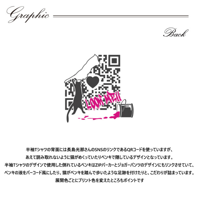 | 商品Data | 長島光那さんとのコラボ企画第8弾! 今回のコラボは半袖Tシャツ、ZIPパーカー、ジョガーパンツをリリース。 【デザイン】 半袖Tシャツの背面には長島光那さんのSNSのリンクである QRコードを使っていますが、あえて読み取れないように猫がめくっていたり ペンキで隠しているデザインとなっています。 半袖Tシャツのデザインで使用した倒れているペンキは ZIPパーカーとジョガーパンツのデザインにもリンクさせていて ペンキの液をバーコード風にしたり、猫がペンキを踏んで歩いたような足跡を付けたりと こだわりが詰まっています。 展開色ごとにプリント色を変えたところもポイントです。 ここでしか手に入らない受注期間限定アイテムです!是非お買い求めください!!! ※商品の発送予定時期は【11月中旬頃~11月下旬頃順次発送予定】となります。 ※受注生産の為、発送予定時期が前後する場合がございます。 ※高額注文の場合には ご注文後にお電話にてご連絡をさせていただく場合がございます。 お電話にてご連絡が取れない場合にはメールにてご連絡させていただき、 ご連絡日より3日以内にご返信をいただけない場合には不正注文の可能性があると判断し トラブル防止のためご注文をキャンセルとさせていただきます。 ※商品によっては撮影時にサンプルを使用しているため若干仕様が異なる場合がございます。 また、サイズ・カラーによっては仕様が異なる場合もございます。 ※手作業で縫製をしているため縫製の仕様により、 個体差が生じてしまいますので、1~2cm程度の誤差は予めご了承くださいませ。 ※洗濯機を使用した場合、お届け時のサイズより多少縮む場合がございます。 洗濯機を使用する場合は裏返してネットに入れることを推奨しております。 また、タンブラー乾燥機を使用しますとプリントが剥がれる恐れがありますので 避けていただきますようお願いいたします。 また、洗濯時の液温は40度以下とし、 塩素系および酸素系漂白剤の使用は避けていただきますようお願いいたします。 アイロンにつきましてもプリント及び刺繍部分は避け、 生地部分にアイロンをかける場合にはあて布をして110度(低温)にてお願いいたします。 ※また、受注生産とさせていただいておりますが、 各色・サイズ毎に生産数に限りがございます為、 生産数の上限に達しました場合在庫切れとなる場合がございます。 |