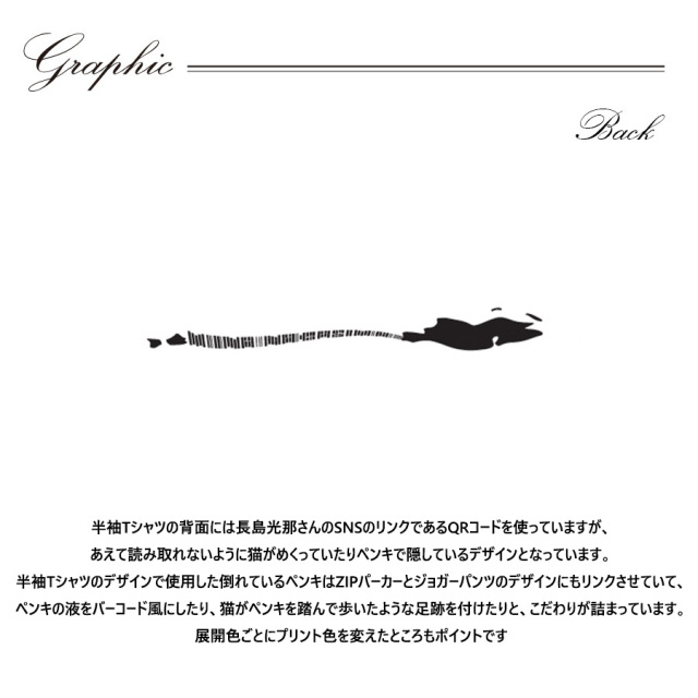 | 商品Data | 長島光那さんとのコラボ企画第8弾! 今回のコラボは半袖Tシャツ、ZIPパーカー、ジョガーパンツをリリース。 【デザイン】 半袖Tシャツの背面には長島光那さんのSNSのリンクである QRコードを使っていますが、あえて読み取れないように猫がめくっていたり ペンキで隠しているデザインとなっています。 半袖Tシャツのデザインで使用した倒れているペンキは ZIPパーカーとジョガーパンツのデザインにもリンクさせていて ペンキの液をバーコード風にしたり、猫がペンキを踏んで歩いたような足跡を付けたりと こだわりが詰まっています。 展開色ごとにプリント色を変えたところもポイントです。 ※商品の発送予定時期は 【11月中旬頃~11月下旬頃順次発送予定】となります。 ※受注生産の為、発送予定時期が前後する場合がございます。 ※高額注文の場合には ご注文後にお電話にてご連絡をさせていただく場合がございます。 お電話にてご連絡が取れない場合にはメールにてご連絡させていただき、 ご連絡日より3日以内にご返信をいただけない場合には不正注文の可能性があると判断し トラブル防止のためご注文をキャンセルとさせていただきます。 ※商品によっては撮影時にサンプルを使用しているため若干仕様が異なる場合がございます。 また、サイズ・カラーによっては仕様が異なる場合もございます。 ※手作業で縫製をしているため縫製の仕様により、 個体差が生じてしまいますので、1~2cm程度の誤差は予めご了承くださいませ。 ※洗濯機を使用した場合、お届け時のサイズより多少縮む場合がございます。 洗濯機を使用する場合は裏返してネットに入れることを推奨しております。 また、タンブラー乾燥機を使用しますとプリントが剥がれる恐れがありますので 避けていただきますようお願いいたします。 また、洗濯時の液温は40度以下とし、 塩素系および酸素系漂白剤の使用は避けていただきますようお願いいたします。 アイロンにつきましてもプリント及び刺繍部分は避け、 生地部分にアイロンをかける場合にはあて布をして110度(低温)にてお願いいたします。 ※また、受注生産とさせていただいておりますが、 各色・サイズ毎に生産数に限りがございます為、 生産数の上限に達しました場合在庫切れとなる場合がございます。 |
