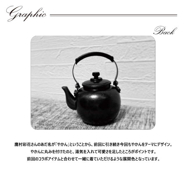| 商品Data | 鷹村彩花さんとのコラボ企画第2弾! 今回のコラボは半袖Tシャツ、ジョガーパンツ、キャップをリリース。 【デザイン】 鷹村彩花さんのあだ名が「やかん」ということから、前回に引き続き今回もやかんをテーマにデザイン。 やかんに丸みを付けたのと、湯気を入れて可愛さを足したところがポイントです。 前回のコラボアイテムと合わせて一緒に着ていただけるような展開色となっています。 ご自身のイメージカラーがオレンジなのでジョガーパンツのオレンジがお気に入りとのことでした。 ここでしか手に入らない受注期間限定アイテムです!是非お買い求めください!!! ※商品の発送予定時期は【10月上旬頃~10月下旬頃順次発送予定】となります。 ※受注生産の為、発送予定時期が前後する場合がございます。 ※高額注文の場合には ご注文後にお電話にてご連絡をさせていただく場合がございます。 お電話にてご連絡が取れない場合にはメールにてご連絡させていただき、 ご連絡日より3日以内にご返信をいただけない場合には不正注文の可能性があると判断し トラブル防止のためご注文をキャンセルとさせていただきます。 ※商品によっては撮影時にサンプルを使用しているため若干仕様が異なる場合がございます。 また、サイズ・カラーによっては仕様が異なる場合もございます。 ※手作業で縫製をしているため縫製の仕様により、 個体差が生じてしまいますので、1~2cm程度の誤差は予めご了承くださいませ。 ※洗濯機を使用した場合、お届け時のサイズより多少縮む場合がございます。 洗濯機を使用する場合は裏返してネットに入れることを推奨しております。 また、タンブラー乾燥機を使用しますとプリントが剥がれる恐れがありますので 避けていただきますようお願いいたします。 また、洗濯時の液温は40度以下とし、 塩素系および酸素系漂白剤の使用は避けていただきますようお願いいたします。 アイロンにつきましてもプリント及び刺繍部分は避け、 生地部分にアイロンをかける場合にはあて布をして110度(低温)にてお願いいたします。 ※また、受注生産とさせていただいておりますが、 各色・サイズ毎に生産数に限りがございます為、 生産数の上限に達しました場合在庫切れとなる場合がございます。 |