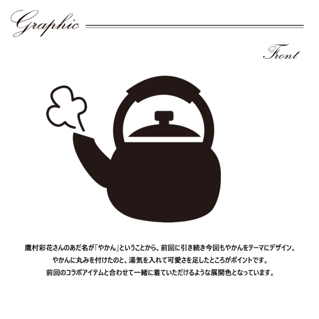 | 商品Data | 鷹村彩花さんとのコラボ企画第2弾! 今回のコラボは半袖Tシャツ、ジョガーパンツ、キャップをリリース。 【デザイン】 鷹村彩花さんのあだ名が「やかん」ということから、前回に引き続き今回もやかんをテーマにデザイン。 やかんに丸みを付けたのと、湯気を入れて可愛さを足したところがポイントです。 前回のコラボアイテムと合わせて一緒に着ていただけるような展開色となっています。 ご自身のイメージカラーがオレンジなのでジョガーパンツのオレンジがお気に入りとのことでした。 ここでしか手に入らない受注期間限定アイテムです!是非お買い求めください!!! ※商品の発送予定時期は【10月上旬頃~10月下旬頃順次発送予定】となります。 ※受注生産の為、発送予定時期が前後する場合がございます。 ※高額注文の場合には ご注文後にお電話にてご連絡をさせていただく場合がございます。 お電話にてご連絡が取れない場合にはメールにてご連絡させていただき、 ご連絡日より3日以内にご返信をいただけない場合には不正注文の可能性があると判断し トラブル防止のためご注文をキャンセルとさせていただきます。 ※商品によっては撮影時にサンプルを使用しているため若干仕様が異なる場合がございます。 また、サイズ・カラーによっては仕様が異なる場合もございます。 ※手作業で縫製をしているため縫製の仕様により、 個体差が生じてしまいますので、1~2cm程度の誤差は予めご了承くださいませ。 ※洗濯機を使用した場合、お届け時のサイズより多少縮む場合がございます。 洗濯機を使用する場合は裏返してネットに入れることを推奨しております。 また、タンブラー乾燥機を使用しますとプリントが剥がれる恐れがありますので 避けていただきますようお願いいたします。 また、洗濯時の液温は40度以下とし、 塩素系および酸素系漂白剤の使用は避けていただきますようお願いいたします。 アイロンにつきましてもプリント及び刺繍部分は避け、 生地部分にアイロンをかける場合にはあて布をして110度(低温)にてお願いいたします。 ※また、受注生産とさせていただいておりますが、 各色・サイズ毎に生産数に限りがございます為、 生産数の上限に達しました場合在庫切れとなる場合がございます。 |