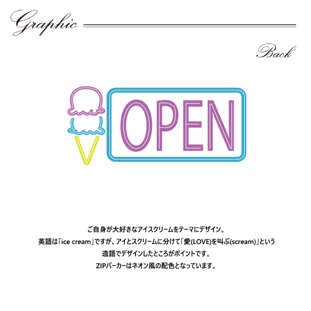 | 商品Data | 汐入あすかさんとのコラボ企画! 今回のコラボは半袖Tシャツ、ZIPパーカー、キャップをリリース。 【デザイン】 ご自身が大好きなアイスクリームをテーマにデザイン。 英語は「ice cream」ですが、アイとスクリームに分けて「愛(LOVE)を叫ぶ(scream)」という 造語でデザインしたところがポイントです。 キャップはアイス屋さんの看板風で、ZIPパーカーはネオン風の配色となっています。 半袖Tシャツはアイスのようなイメージの展開色を選び、 その中でもラベンダーが特にお気に入りですとのことでした。 ここでしか手に入らない受注期間限定アイテムです!是非お買い求めください!!! ※商品の発送予定時期は【10月中旬頃~10月下旬頃順次発送予定】となります。 ※受注生産の為、発送予定時期が前後する場合がございます。 ※高額注文の場合には ご注文後にお電話にてご連絡をさせていただく場合がございます。 お電話にてご連絡が取れない場合にはメールにてご連絡させていただき、 ご連絡日より3日以内にご返信をいただけない場合には不正注文の可能性があると判断し トラブル防止のためご注文をキャンセルとさせていただきます。 ※商品によっては撮影時にサンプルを使用しているため若干仕様が異なる場合がございます。 また、サイズ・カラーによっては仕様が異なる場合もございます。 ※手作業で縫製をしているため縫製の仕様により、 個体差が生じてしまいますので、1~2cm程度の誤差は予めご了承くださいませ。 ※洗濯機を使用した場合、お届け時のサイズより多少縮む場合がございます。 洗濯機を使用する場合は裏返してネットに入れることを推奨しております。 また、タンブラー乾燥機を使用しますとプリントが剥がれる恐れがありますので 避けていただきますようお願いいたします。 また、洗濯時の液温は40度以下とし、 塩素系および酸素系漂白剤の使用は避けていただきますようお願いいたします。 アイロンにつきましてもプリント及び刺繍部分は避け、 生地部分にアイロンをかける場合にはあて布をして110度(低温)にてお願いいたします。 ※また、受注生産とさせていただいておりますが、 各色・サイズ毎に生産数に限りがございます為、 生産数の上限に達しました場合在庫切れとなる場合がございます。 |