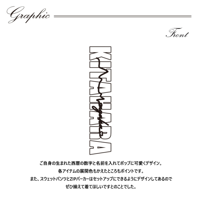 | 商品Data | 北原沙弥香さんとのコラボ企画第2弾! 今回のコラボは半袖Tシャツ、ブレスレット、ZIPパーカー、スウェットパンツをリリース。 【デザイン】 ご自身の生まれた西暦の数字と名前を入れてポップに可愛くデザイン。 各アイテムの展開色もかえたところもポイントです。 また、スウェットパンツとZIPパーカーはセットアップにできるようにデザインしてあるので ぜひ揃えて着てほしいですとのことでした。 ここでしか手に入らない受注期間限定アイテムです!是非お買い求めください!!! ※商品の発送予定時期は 【10月下旬頃~11月上旬頃順次発送予定】となります。 ※受注生産の為、発送予定時期が前後する場合がございます。 ※高額注文の場合には ご注文後にお電話にてご連絡をさせていただく場合がございます。 お電話にてご連絡が取れない場合にはメールにてご連絡させていただき、 ご連絡日より3日以内にご返信をいただけない場合には不正注文の可能性があると判断し トラブル防止のためご注文をキャンセルとさせていただきます。 ※商品によっては撮影時にサンプルを使用しているため若干仕様が異なる場合がございます。 また、サイズ・カラーによっては仕様が異なる場合もございます。 ※手作業で縫製をしているため縫製の仕様により、 個体差が生じてしまいますので、1~2cm程度の誤差は予めご了承くださいませ。 ※洗濯機を使用した場合、お届け時のサイズより多少縮む場合がございます。 洗濯機を使用する場合は裏返してネットに入れることを推奨しております。 また、タンブラー乾燥機を使用しますとプリントが剥がれる恐れがありますので 避けていただきますようお願いいたします。 また、洗濯時の液温は40度以下とし、 塩素系および酸素系漂白剤の使用は避けていただきますようお願いいたします。 アイロンにつきましてもプリント及び刺繍部分は避け、 生地部分にアイロンをかける場合にはあて布をして110度(低温)にてお願いいたします。 ※また、受注生産とさせていただいておりますが、 各色・サイズ毎に生産数に限りがございます為、 生産数の上限に達しました場合在庫切れとなる場合がございます。 |