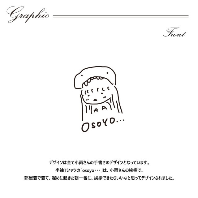 | 商品Data | 小雨さんとのコラボ企画! 今回のコラボは半袖Tシャツ、ZIPパーカー、トートバッグをリリース。 【デザイン】 デザインは全て小雨さんの手書きのデザインとなっています。 半袖Tシャツの「osoyo・・・」は、小雨さんの挨拶で、 部屋着で着て、遅めに起きた朝一番に、挨拶できたらいいなと思ってデザインされました。 ここでしか手に入らない受注期間限定アイテムです!是非お買い求めください!!! ※商品の発送予定時期は【11月上旬頃~11月中旬頃順次発送予定】となります。 ※受注生産の為、発送予定時期が前後する場合がございます。 ※高額注文の場合には ご注文後にお電話にてご連絡をさせていただく場合がございます。 お電話にてご連絡が取れない場合にはメールにてご連絡させていただき、 ご連絡日より3日以内にご返信をいただけない場合には不正注文の可能性があると判断し トラブル防止のためご注文をキャンセルとさせていただきます。 ※商品によっては撮影時にサンプルを使用しているため若干仕様が異なる場合がございます。 また、サイズ・カラーによっては仕様が異なる場合もございます。 ※手作業で縫製をしているため縫製の仕様により、 個体差が生じてしまいますので、1~2cm程度の誤差は予めご了承くださいませ。 ※洗濯機を使用した場合、お届け時のサイズより多少縮む場合がございます。 洗濯機を使用する場合は裏返してネットに入れることを推奨しております。 また、タンブラー乾燥機を使用しますとプリントが剥がれる恐れがありますので 避けていただきますようお願いいたします。 また、洗濯時の液温は40度以下とし、 塩素系および酸素系漂白剤の使用は避けていただきますようお願いいたします。 アイロンにつきましてもプリント及び刺繍部分は避け、 生地部分にアイロンをかける場合にはあて布をして110度(低温)にてお願いいたします。 ※また、受注生産とさせていただいておりますが、 各色・サイズ毎に生産数に限りがございます為、 生産数の上限に達しました場合在庫切れとなる場合がございます。 |