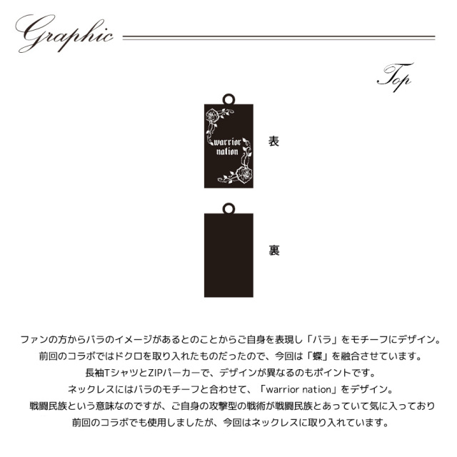 | 商品Data | 鈴木優さんとのコラボ企画第2弾! 今回のコラボはZIPパーカー、長袖Tシャツ、ネックレスをリリース。 【デザイン】 ファンの方からバラのイメージがあるとのことからご自身を表現し「バラ」をモチーフにデザイン。 前回のコラボではドクロを取り入れたものだったので、今回は「蝶」を融合させています。 長袖TシャツとZIPパーカーで、デザインが異なるのもポイントです。 ネックレスにはバラのモチーフと合わせて、「warrior nation」をデザイン。 戦闘民族という意味なのですが、ご自身の攻撃型の戦術が戦闘民族とあっていて気に入っており 前回のコラボでも使用しましたが、今回はネックレスに取り入れています。 ここでしか手に入らない受注期間限定アイテムです!是非お買い求めください!!! メッキ加工:国内加工 原型作成:国内 ※アレルギーの反応等がその時の体調や個人差により出る場合がございますので、 金属製アクセサリーを初めてご使用の場合は必ず「パッチテスト」をしてご使用ください。※ 【パッチテストとは】 金属アレルギーの場合、特殊なテープに24種類の金属試薬をつけてアレルギーの有無を調べる検査です。 皮膚科などで相談をすれば身近にできる検査です。 いくつか検査中に注意する点がありますのでテストを受ける病院で検査について相談してください。 ※現時点での商品の発送予定時期は【1月下旬頃~2月下旬頃順次発送予定】を予定しております。 ※受注生産の為、発送予定時期が前後する場合がございます。 ※高額注文の場合には ご注文後にお電話にてご連絡をさせていただく場合がございます。 お電話にてご連絡が取れない場合にはメールにてご連絡させていただき、 ご連絡日より3日以内にご返信をいただけない場合には不正注文の可能性があると判断し トラブル防止のためご注文をキャンセルとさせていただきます。 また、受注生産とさせていただいておりますが、 各色・サイズ毎に生産数を設けさせて頂いております為、 生産数の上限に達しました場合在庫切れとなる場合がございます。 ※※商品画像は照明などの影響により実際の色と異なる場合がございます ※加工の特性上、仕上がり寸法及び色のニュアンスが多少異なることがあります。 |