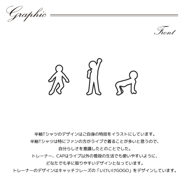 | 商品Data | 池田裕楽さんとのコラボ企画! 今回のコラボは半袖Tシャツ、トレーナー、キャップをリリース。 【デザイン】 半袖Tシャツのデザインはご自身の特技をイラストにしています。 半袖Tシャツは特にファンの方がライブで着ることが多いと思うので、自分らしさを意識したとのことでした。 トレーナー、CAPはライブ以外の普段の生活でも使いやすいように、どなたでも手に取りやすいデザインとなっています。 トレーナーのデザインはキャッチフレーズの「いけいけGOGO」をデザインしています。 ここでしか手に入らない受注期間限定アイテムです!是非お買い求めください!!! ※商品の発送予定時期は 【2月下旬頃~3月上旬順次発送予定】となります。 ※受注生産の為、発送予定時期が前後する場合がございます。 ※高額注文の場合には ご注文後にお電話にてご連絡をさせていただく場合がございます。 お電話にてご連絡が取れない場合にはメールにてご連絡させていただき、 ご連絡日より3日以内にご返信をいただけない場合には不正注文の可能性があると判断し トラブル防止のためご注文をキャンセルとさせていただきます。 ※商品によっては撮影時にサンプルを使用しているため若干仕様が異なる場合がございます。 また、サイズ・カラーによっては仕様が異なる場合もございます。 ※手作業で縫製をしているため縫製の仕様により、 個体差が生じてしまいますので、1~2cm程度の誤差は予めご了承くださいませ。 ※洗濯機を使用した場合、お届け時のサイズより多少縮む場合がございます。 洗濯機を使用する場合は裏返してネットに入れることを推奨しております。 また、タンブラー乾燥機を使用しますとプリントが剥がれる恐れがありますので 避けていただきますようお願いいたします。 また、洗濯時の液温は40度以下とし、 塩素系および酸素系漂白剤の使用は避けていただきますようお願いいたします。 アイロンにつきましてもプリント及び刺繍部分は避け、 生地部分にアイロンをかける場合にはあて布をして110度(低温)にてお願いいたします。 ※また、受注生産とさせていただいておりますが、 各色・サイズ毎に生産数に限りがございます為、 生産数の上限に達しました場合在庫切れとなる場合がございます。 |