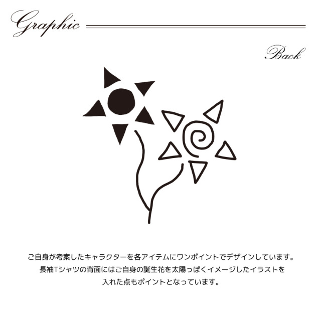 | 商品Data | 岡田あずみさんとのコラボ企画! 今回のコラボは長袖Tシャツ、プルオーバーパーカー、キャップをリリース。 【デザイン】 ご自身が考案したキャラクターを各アイテムにワンポイントでデザインしています。 長袖Tシャツの背面にはご自身の誕生花を太陽っぽくイメージしたイラストを入れた点もポイントとなっています。 ここでしか手に入らない受注期間限定アイテムです!是非お買い求めください!!! ※商品の発送予定時期は 【1月下旬頃~2月下旬頃順次発送予定】となります。 ※受注生産の為、発送予定時期が前後する場合がございます。 ※高額注文の場合には ご注文後にお電話にてご連絡をさせていただく場合がございます。 お電話にてご連絡が取れない場合にはメールにてご連絡させていただき、 ご連絡日より3日以内にご返信をいただけない場合には不正注文の可能性があると判断し トラブル防止のためご注文をキャンセルとさせていただきます。 ※商品によっては撮影時にサンプルを使用しているため若干仕様が異なる場合がございます。 また、サイズ・カラーによっては仕様が異なる場合もございます。 ※手作業で縫製をしているため縫製の仕様により、 個体差が生じてしまいますので、1~2cm程度の誤差は予めご了承くださいませ。 ※洗濯機を使用した場合、お届け時のサイズより多少縮む場合がございます。 洗濯機を使用する場合は裏返してネットに入れることを推奨しております。 また、タンブラー乾燥機を使用しますとプリントが剥がれる恐れがありますので 避けていただきますようお願いいたします。 また、洗濯時の液温は40度以下とし、 塩素系および酸素系漂白剤の使用は避けていただきますようお願いいたします。 アイロンにつきましてもプリント及び刺繍部分は避け、 生地部分にアイロンをかける場合にはあて布をして110度(低温)にてお願いいたします。 ※また、受注生産とさせていただいておりますが、各色・サイズ毎に生産数に限りがございます為、 生産数の上限に達しました場合在庫切れとなる場合がございます。 |