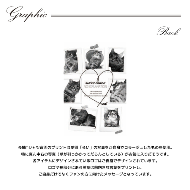 | 商品Data | HARUKIさんとのコラボ企画! 今回のコラボは長袖Tシャツ、プルオーバーパーカー、ネックレスをリリース。 【デザイン】 長袖Tシャツ背面のプリントは愛猫「るい」の写真を ご自身でコラージュしたものを使用。 特に真ん中右の写真(爪が引っかかって だらんとしている)がお気に入りだそうです。 各アイテムにデザインされているロゴは ご自身でデザインされています。 ロゴや袖部分にある英語は前向きな言葉をプリントし、 ご自身だけでなくファンの方に向けたメッセージとなっています。 ここでしか手に入らない受注期間限定アイテムです!是非お買い求めください!!! ※商品の発送予定時期は 【2月下旬頃~3月上旬頃順次発送予定】となります。 ※受注生産の為、発送予定時期が前後する場合がございます。 ※高額注文の場合には ご注文後にお電話にてご連絡をさせていただく場合がございます。 お電話にてご連絡が取れない場合にはメールにてご連絡させていただき、 ご連絡日より3日以内にご返信をいただけない場合には不正注文の可能性があると判断し トラブル防止のためご注文をキャンセルとさせていただきます。 ※商品によっては撮影時にサンプルを使用しているため若干仕様が異なる場合がございます。 また、サイズ・カラーによっては仕様が異なる場合もございます。 ※手作業で縫製をしているため縫製の仕様により、 個体差が生じてしまいますので、1~2cm程度の誤差は予めご了承くださいませ。 ※洗濯機を使用した場合、お届け時のサイズより多少縮む場合がございます。 洗濯機を使用する場合は裏返してネットに入れることを推奨しております。 また、タンブラー乾燥機を使用しますとプリントが剥がれる恐れがありますので 避けていただきますようお願いいたします。 また、洗濯時の液温は40度以下とし、 塩素系および酸素系漂白剤の使用は避けていただきますようお願いいたします。 アイロンにつきましてもプリント及び刺繍部分は避け、 生地部分にアイロンをかける場合にはあて布をして110度(低温)にてお願いいたします。 ※また、受注生産とさせていただいておりますが、 各色・サイズ毎に生産数に限りがございます為、 生産数の上限に達しました場合在庫切れとなる場合がございます。 |