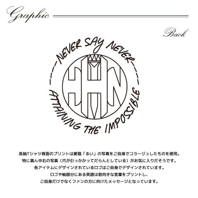 | 商品Data | HARUKIさんとのコラボ企画! 今回のコラボは長袖Tシャツ、プルオーバーパーカー、ネックレスをリリース。 【デザイン】 長袖Tシャツ背面のプリントは愛猫「るい」の写真を ご自身でコラージュしたものを使用。 特に真ん中右の写真(爪が引っかかって だらんとしている)がお気に入りだそうです。 各アイテムにデザインされているロゴは ご自身でデザインされています。 ロゴや袖部分にある英語は前向きな言葉をプリントし、 ご自身だけでなくファンの方に向けたメッセージとなっています。 ここでしか手に入らない受注期間限定アイテムです!是非お買い求めください!!! ※商品の発送予定時期は【2月下旬頃~3月上旬頃順次発送予定】となります。 ※受注生産の為、発送予定時期が前後する場合がございます。 ※高額注文の場合には ご注文後にお電話にてご連絡をさせていただく場合がございます。 お電話にてご連絡が取れない場合にはメールにてご連絡させていただき、 ご連絡日より3日以内にご返信をいただけない場合には不正注文の可能性があると判断し トラブル防止のためご注文をキャンセルとさせていただきます。 ※商品によっては撮影時にサンプルを使用しているため若干仕様が異なる場合がございます。 また、サイズ・カラーによっては仕様が異なる場合もございます。 ※手作業で縫製をしているため縫製の仕様により、 個体差が生じてしまいますので、1~2cm程度の誤差は予めご了承くださいませ。 ※洗濯機を使用した場合、お届け時のサイズより多少縮む場合がございます。 洗濯機を使用する場合は裏返してネットに入れることを推奨しております。 また、タンブラー乾燥機を使用しますとプリントが剥がれる恐れがありますので 避けていただきますようお願いいたします。 また、洗濯時の液温は40度以下とし、 塩素系および酸素系漂白剤の使用は避けていただきますようお願いいたします。 アイロンにつきましてもプリント及び刺繍部分は避け、 生地部分にアイロンをかける場合にはあて布をして110度(低温)にてお願いいたします。 ※また、受注生産とさせていただいておりますが、 各色・サイズ毎に生産数に限りがございます為、 生産数の上限に達しました場合在庫切れとなる場合がございます。 |