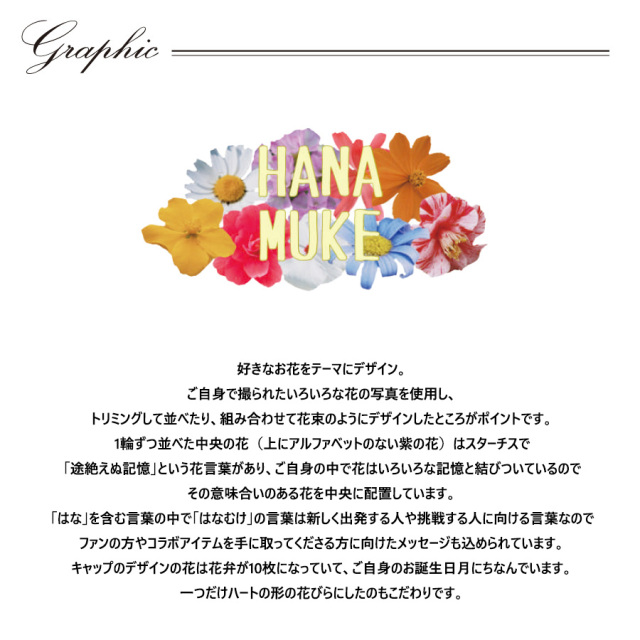 | 商品Data | 山根理輝さんとのコラボ企画! 今回のコラボは長袖Tシャツ、プルオーバーパーカー、キャップをリリース。 【デザイン】 好きなお花をテーマにデザイン。 ご自身で撮られたいろいろな花の写真を使用し、 トリミングして並べたり、組み合わせて花束のようにデザインしたところがポイントです。 1輪ずつ並べた中央の花(上にアルファベットのない紫の花)はスターチスで 「途絶えぬ記憶」という花言葉があり、ご自身の中で花はいろいろな記憶と結びついているのでその意味合いのある花を中央に配置しています。 「はな」を含む言葉の中で「はなむけ」の言葉は新しく出発する人や挑戦する人に向ける言葉なので ファンの方やコラボアイテムを手に取ってくださる方に向けたメッセージも込められています。 キャップのデザインの花は花弁が10枚になっていて、ご自身のお誕生日月にちなんでいます。 一つだけハートの形の花びらにしたのもこだわりです。 ここでしか手に入らない受注期間限定アイテムです!是非お買い求めください!!! ※商品の発送予定時期は 【3月中旬頃~3月下旬頃順次発送予定】 となります。 ※受注生産の為、発送予定時期が前後する場合がございます。 ※高額注文の場合には ご注文後にお電話にてご連絡をさせていただく場合がございます。 お電話にてご連絡が取れない場合にはメールにてご連絡させていただき、 ご連絡日より3日以内にご返信をいただけない場合には不正注文の可能性があると判断し トラブル防止のためご注文をキャンセルとさせていただきます。 ※商品によっては撮影時にサンプルを使用しているため若干仕様が異なる場合がございます。 また、サイズ・カラーによっては仕様が異なる場合もございます。 ※手作業で縫製をしているため縫製の仕様により、 個体差が生じてしまいますので、1~2cm程度の誤差は予めご了承くださいませ。 ※洗濯機を使用した場合、お届け時のサイズより多少縮む場合がございます。 洗濯機を使用する場合は裏返してネットに入れることを推奨しております。 また、タンブラー乾燥機を使用しますとプリントが剥がれる恐れがありますので 避けていただきますようお願いいたします。 また、洗濯時の液温は40度以下とし、 塩素系および酸素系漂白剤の使用は避けていただきますようお願いいたします。 アイロンにつきましてもプリント及び刺繍部分は避け、 生地部分にアイロンをかける場合にはあて布をして110度(低温)にてお願いいたします。 ※また、受注生産とさせていただいておりますが、 各色・サイズ毎に生産数に限りがございます為、 生産数の上限に達しました場合在庫切れとなる場合がございます。 |