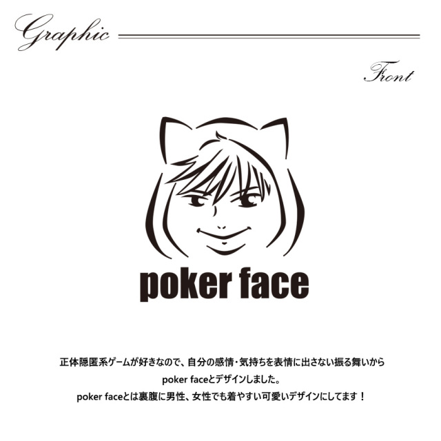 | 商品Data | せるふぃさんとのコラボ企画! 今回のコラボは半袖Tシャツ、プルオーバーパーカー、クッション、トートバッグをリリース。 【デザイン】 正体隠匿系ゲームが好きなので、自分の感情・気持ちを表情に出さない振る舞いから poker faceとデザインしました。 poker faceとは裏腹に男性、女性でも着やすい可愛いデザインにしてます! ここでしか手に入らない受注期間限定アイテムです!是非お買い求めください!!! ※商品の発送予定時期は 【4月中旬~4月下旬頃順次発送予定】となります。 ※受注生産の為、発送予定時期が前後する場合がございます。 ※高額注文の場合にはご注文後にお電話にてご連絡をさせていただく場合がございます。 お電話にてご連絡が取れない場合にはメールにてご連絡させていただき、 ご連絡日より3日以内にご返信をいただけない場合には不正注文の可能性があると判断し トラブル防止のためご注文をキャンセルとさせていただきます。 ※商品によっては撮影時にサンプルを使用しているため若干仕様が異なる場合がございます。 また、サイズ・カラーによっては仕様が異なる場合もございます。 ※手作業で縫製をしているため縫製の仕様により、 個体差が生じてしまいますので、1~2cm程度の誤差は予めご了承くださいませ。 ※洗濯機を使用した場合、お届け時のサイズより多少縮む場合がございます。 洗濯機を使用する場合は裏返してネットに入れることを推奨しております。 また、タンブラー乾燥機を使用しますとプリントが剥がれる恐れがありますので 避けていただきますようお願いいたします。 また、洗濯時の液温は40度以下とし、 塩素系および酸素系漂白剤の使用は避けていただきますようお願いいたします。 アイロンにつきましてもプリント及び刺繍部分は避け、 生地部分にアイロンをかける場合にはあて布をして110度(低温)にてお願いいたします。 ※また、受注生産とさせていただいておりますが、 各色・サイズ毎に生産数に限りがございます為、 生産数の上限に達しました場合在庫切れとなる場合がございます。 |