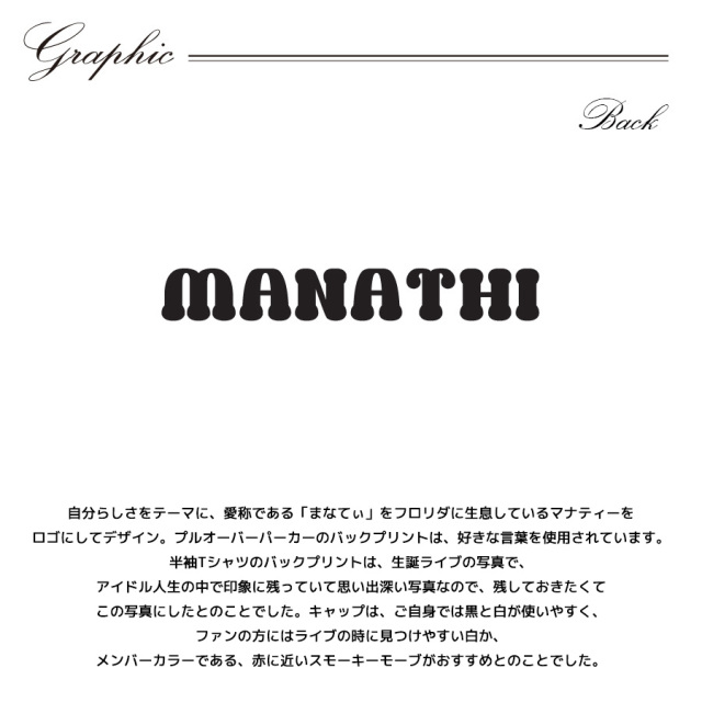 | 商品Data | 藤木愛さんとのコラボ企画! 今回のコラボは半袖Tシャツ、プルオーバーパーカー、キャップをリリース。 【デザイン】 自分らしさをテーマに、愛称である「まなてぃ」をフロリダに生息しているマナティーをロゴにしてデザイン。 プルオーバーパーカーのバックプリントは、好きな言葉を使用されています。 半袖Tシャツのバックプリントは、生誕ライブの写真で、 アイドル人生の中で印象に残っていて思い出深い写真なので、残しておきたくてこの写真にしたとのことでした。 キャップは、ご自身では黒と白が使いやすく、ファンの方にはライブの時に見つけやすい白か、 メンバーカラーである、赤に近いスモーキーモーブがおすすめとのことでした。 ここでしか手に入らない受注期間限定アイテムです!是非お買い求めください!!! ※商品の発送予定時期は 【4月下旬頃〜5月上旬頃順次発送予定】となります。 ※受注生産の為、発送予定時期が前後する場合がございます。 ※高額注文の場合には ご注文後にお電話にてご連絡をさせていただく場合がございます。 お電話にてご連絡が取れない場合にはメールにてご連絡させていただき、 ご連絡日より3日以内にご返信をいただけない場合には不正注文の可能性があると判断し トラブル防止のためご注文をキャンセルとさせていただきます。 ※商品によっては撮影時にサンプルを使用しているため若干仕様が異なる場合がございます。 また、サイズ・カラーによっては仕様が異なる場合もございます。 ※手作業で縫製をしているため縫製の仕様により、 個体差が生じてしまいますので、1~2cm程度の誤差は予めご了承くださいませ。 ※洗濯機を使用した場合、お届け時のサイズより多少縮む場合がございます。 洗濯機を使用する場合は裏返してネットに入れることを推奨しております。 また、タンブラー乾燥機を使用しますとプリントが剥がれる恐れがありますので 避けていただきますようお願いいたします。 また、洗濯時の液温は40度以下とし、 塩素系および酸素系漂白剤の使用は避けていただきますようお願いいたします。 アイロンにつきましてもプリント及び刺繍部分は避け、 生地部分にアイロンをかける場合にはあて布をして110度(低温)にてお願いいたします。 ※また、受注生産とさせていただいておりますが、 各色・サイズ毎に生産数に限りがございます為、 生産数の上限に達しました場合在庫切れとなる場合がございます。 |