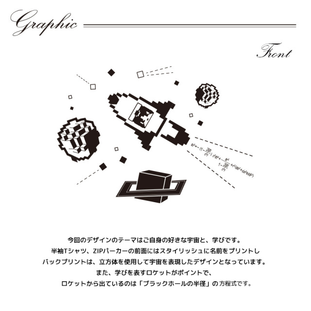 | 商品Data | タツナミ シュウイチさんとのコラボ企画! 今回のコラボは半袖Tシャツ、ZIPパーカー、トートバッグをリリース。 【デザイン】 今回のデザインのテーマはご自身の好きな宇宙と、学びです。 半袖Tシャツ、ZIPパーカーの前面にはスタイリッシュに名前をプリントし バックプリントは、立方体を使用して宇宙を表現したデザインとなっています。 また、学びを表すロケットがポイントで、 ロケットから出ているのは「ブラックホールの半径」の方程式です。 ここでしか手に入らない受注期間限定アイテムです!是非お買い求めください!!! ※商品の発送予定時期は【5月中旬~5月下旬頃順次発送予定】となります。 ※受注生産の為、発送予定時期が前後する場合がございます。 ※高額注文の場合には ご注文後にお電話にてご連絡をさせていただく場合がございます。 お電話にてご連絡が取れない場合にはメールにてご連絡させていただき、 ご連絡日より3日以内にご返信をいただけない場合には不正注文の可能性があると判断し トラブル防止のためご注文をキャンセルとさせていただきます。 ※商品によっては撮影時にサンプルを使用しているため若干仕様が異なる場合がございます。 また、サイズ・カラーによっては仕様が異なる場合もございます。 ※手作業で縫製をしているため縫製の仕様により、 個体差が生じてしまいますので、1~2cm程度の誤差は予めご了承くださいませ。 ※洗濯機を使用した場合、お届け時のサイズより多少縮む場合がございます。 洗濯機を使用する場合は裏返してネットに入れることを推奨しております。 また、タンブラー乾燥機を使用しますとプリントが剥がれる恐れがありますので 避けていただきますようお願いいたします。 また、洗濯時の液温は40度以下とし、 塩素系および酸素系漂白剤の使用は避けていただきますようお願いいたします。 アイロンにつきましてもプリント及び刺繍部分は避け、 生地部分にアイロンをかける場合にはあて布をして110度(低温)にてお願いいたします。 ※また、受注生産とさせていただいておりますが、 各色・サイズ毎に生産数に限りがございます為、 生産数の上限に達しました場合在庫切れとなる場合がございます。 |