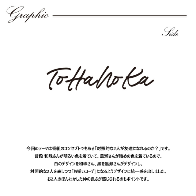 | 商品Data | とはのかさんとのコラボ企画! 今回のコラボは長袖Tシャツ TYPE-A、長袖Tシャツ TYPE-B、ZIPパーカー、キャップ TYPE-A、キャップ TYPE-Bをリリース。 【デザイン】 今回のテーマは番組のコンセプトでもある「対照的な2人が友達になれるのか?」です。 普段 和珠さんが明るい色を着ていて、黒瀬さんが暗めの色を着ているので、 白のデザインを和珠さん、黒を黒瀬さんがデザインし、対照的な2人を表しつつ 「お揃いコーデ」になるようデザインに統一感を出しました。 お2人のほんわかした仲の良さが感じられるのもポイントです。 ここでしか手に入らない受注期間限定アイテムです!是非お買い求めください!!! ※商品の発送予定時期は【6月中旬頃~6月下旬頃順次発送予定】となります。 ※受注生産の為、発送予定時期が前後する場合がございます。 ※高額注文の場合には ご注文後にお電話にてご連絡をさせていただく場合がございます。 お電話にてご連絡が取れない場合にはメールにてご連絡させていただき、 ご連絡日より3日以内にご返信をいただけない場合には不正注文の可能性があると判断し トラブル防止のためご注文をキャンセルとさせていただきます。 ※商品によっては撮影時にサンプルを使用しているため若干仕様が異なる場合がございます。 また、サイズ・カラーによっては仕様が異なる場合もございます。 ※手作業で縫製をしているため縫製の仕様により、 個体差が生じてしまいますので、1~2cm程度の誤差は予めご了承くださいませ。 ※洗濯機を使用した場合、お届け時のサイズより多少縮む場合がございます。 洗濯機を使用する場合は裏返してネットに入れることを推奨しております。 また、タンブラー乾燥機を使用しますとプリントが剥がれる恐れがありますので 避けていただきますようお願いいたします。 また、洗濯時の液温は40度以下とし、 塩素系および酸素系漂白剤の使用は避けていただきますようお願いいたします。 アイロンにつきましてもプリント及び刺繍部分は避け、 生地部分にアイロンをかける場合にはあて布をして110度(低温)にてお願いいたします。 ※また、受注生産とさせていただいておりますが、 各色・サイズ毎に生産数に限りがございます為、 生産数の上限に達しました場合在庫切れとなる場合がございます。 |