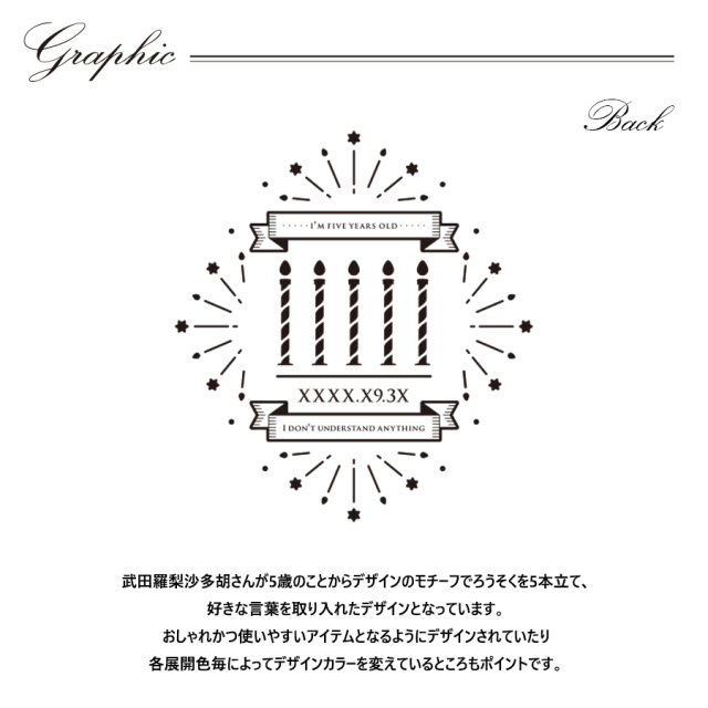 | 商品Data | 武田 羅梨沙 多胡さんとのコラボ企画! 今回のコラボはトレーナー、半袖Tシャツ、キャップをリリース。 【デザイン】 武田羅梨沙多胡さんが5歳のことからデザインのモチーフでろうそくを5本立て、 好きな言葉を取り入れたデザインとなっています。 おしゃれかつ使いやすいアイテムとなるようにデザインされていたり 各展開色毎によってデザインカラーを変えているところもポイントです。 ここでしか手に入らない受注期間限定アイテムです!是非お買い求めください!!! ※商品の発送予定時期は 【6月中旬頃~6月下旬頃順次発送予定】となります。 ※受注生産の為、発送予定時期が前後する場合がございます。 ※高額注文の場合には ご注文後にお電話にてご連絡をさせていただく場合がございます。 お電話にてご連絡が取れない場合にはメールにてご連絡させていただき、 ご連絡日より3日以内にご返信をいただけない場合には不正注文の可能性があると判断し トラブル防止のためご注文をキャンセルとさせていただきます。 ※商品によっては撮影時にサンプルを使用しているため若干仕様が異なる場合がございます。 また、サイズ・カラーによっては仕様が異なる場合もございます。 ※手作業で縫製をしているため縫製の仕様により、 個体差が生じてしまいますので、1~2cm程度の誤差は予めご了承くださいませ。 ※洗濯機を使用した場合、お届け時のサイズより多少縮む場合がございます。 洗濯機を使用する場合は裏返してネットに入れることを推奨しております。 また、タンブラー乾燥機を使用しますとプリントが剥がれる恐れがありますので 避けていただきますようお願いいたします。 また、洗濯時の液温は40度以下とし、 塩素系および酸素系漂白剤の使用は避けていただきますようお願いいたします。 アイロンにつきましてもプリント及び刺繍部分は避け、 生地部分にアイロンをかける場合にはあて布をして110度(低温)にてお願いいたします。 ※また、受注生産とさせていただいておりますが、 各色・サイズ毎に生産数に限りがございます為、 生産数の上限に達しました場合在庫切れとなる場合がございます。 |