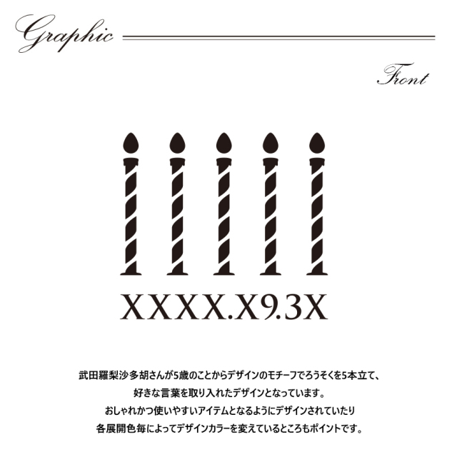 | 商品Data | 武田 羅梨沙 多胡さんとのコラボ企画! 今回のコラボはトレーナー、半袖Tシャツ、キャップをリリース。 【デザイン】 武田羅梨沙多胡さんが5歳のことからデザインのモチーフでろうそくを5本立て、 好きな言葉を取り入れたデザインとなっています。 おしゃれかつ使いやすいアイテムとなるようにデザインされていたり 各展開色毎によってデザインカラーを変えているところもポイントです。 ここでしか手に入らない受注期間限定アイテムです!是非お買い求めください!!! ※商品の発送予定時期は【6月中旬頃~6月下旬頃順次発送予定】となります。 ※受注生産の為、発送予定時期が前後する場合がございます。 ※高額注文の場合には ご注文後にお電話にてご連絡をさせていただく場合がございます。 お電話にてご連絡が取れない場合にはメールにてご連絡させていただき、 ご連絡日より3日以内にご返信をいただけない場合には不正注文の可能性があると判断し トラブル防止のためご注文をキャンセルとさせていただきます。 ※商品によっては撮影時にサンプルを使用しているため若干仕様が異なる場合がございます。 また、サイズ・カラーによっては仕様が異なる場合もございます。 ※手作業で縫製をしているため縫製の仕様により、 個体差が生じてしまいますので、1~2cm程度の誤差は予めご了承くださいませ。 ※洗濯機を使用した場合、お届け時のサイズより多少縮む場合がございます。 洗濯機を使用する場合は裏返してネットに入れることを推奨しております。 また、タンブラー乾燥機を使用しますとプリントが剥がれる恐れがありますので 避けていただきますようお願いいたします。 また、洗濯時の液温は40度以下とし、 塩素系および酸素系漂白剤の使用は避けていただきますようお願いいたします。 アイロンにつきましてもプリント及び刺繍部分は避け、 生地部分にアイロンをかける場合にはあて布をして110度(低温)にてお願いいたします。 ※また、受注生産とさせていただいておりますが、 各色・サイズ毎に生産数に限りがございます為、 生産数の上限に達しました場合在庫切れとなる場合がございます。 |