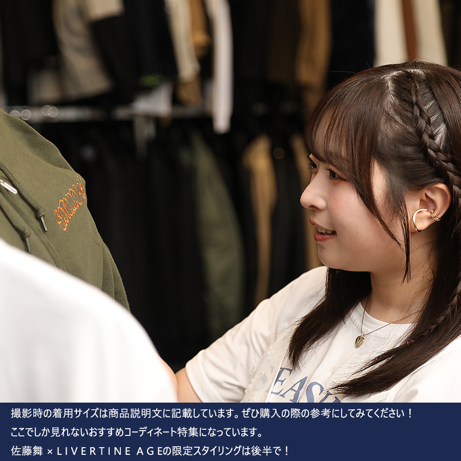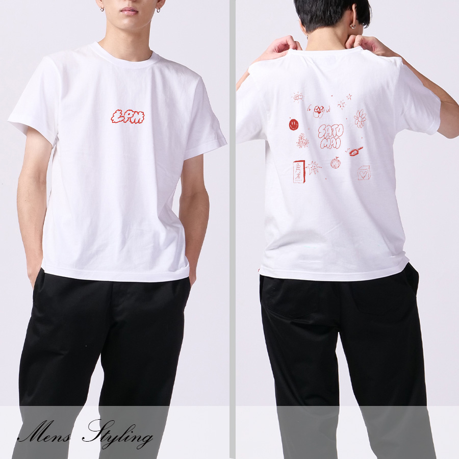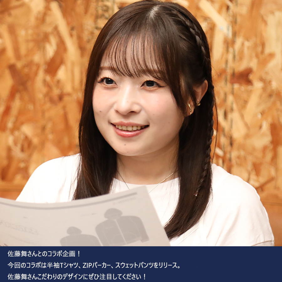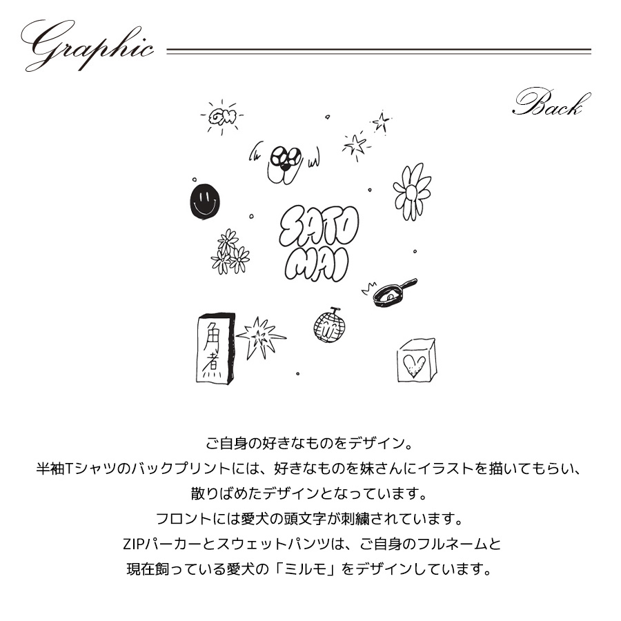 | 商品Data | 佐藤舞さんとのコラボ企画! 今回のコラボは半袖Tシャツ、ZIPパーカー、スウェットパンツをリリース。 【デザイン】 ご自身の好きなものをデザイン。 半袖Tシャツのバックプリントには、好きなものを妹さんにイラストを描いてもらい、 散りばめたデザインとなっています。 フロントには愛犬の頭文字が刺繍されています。 ZIPパーカーとスウェットパンツは、ご自身のフルネームと現在飼っている愛犬の「ミルモ」 をデザインしています。 ここでしか手に入らない受注期間限定アイテムです!是非お買い求めください!!!