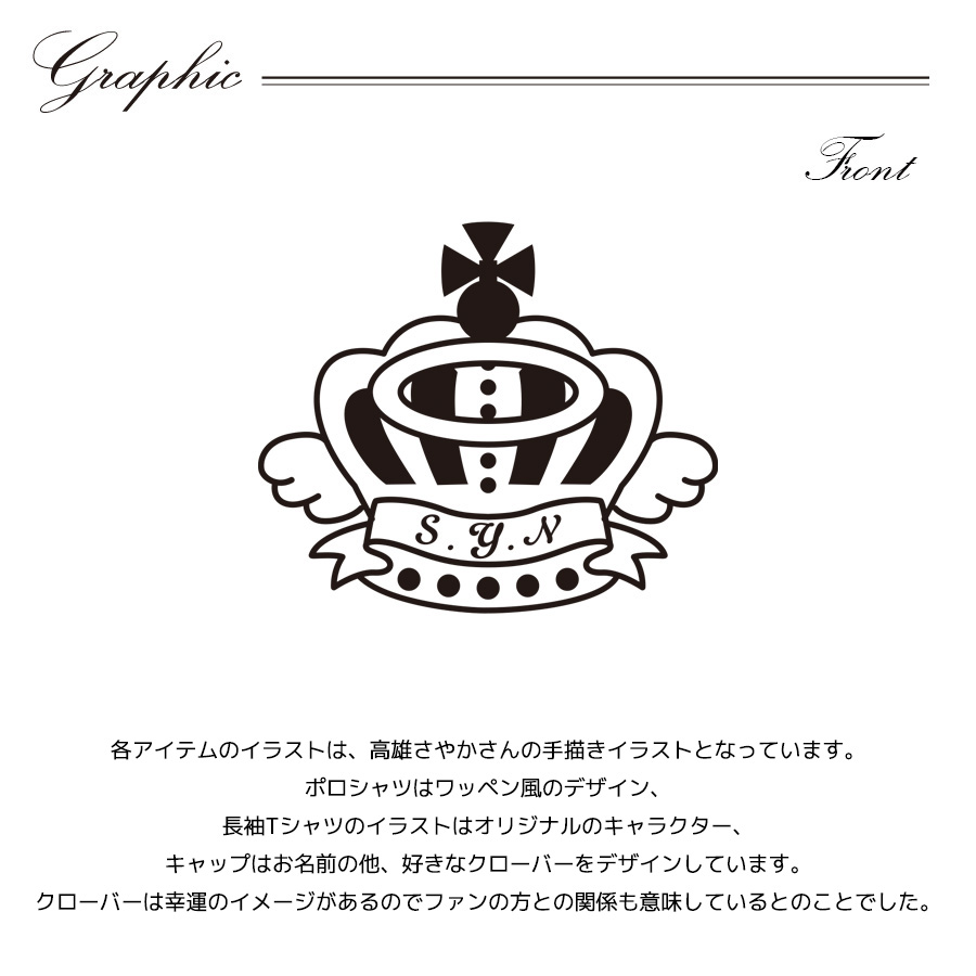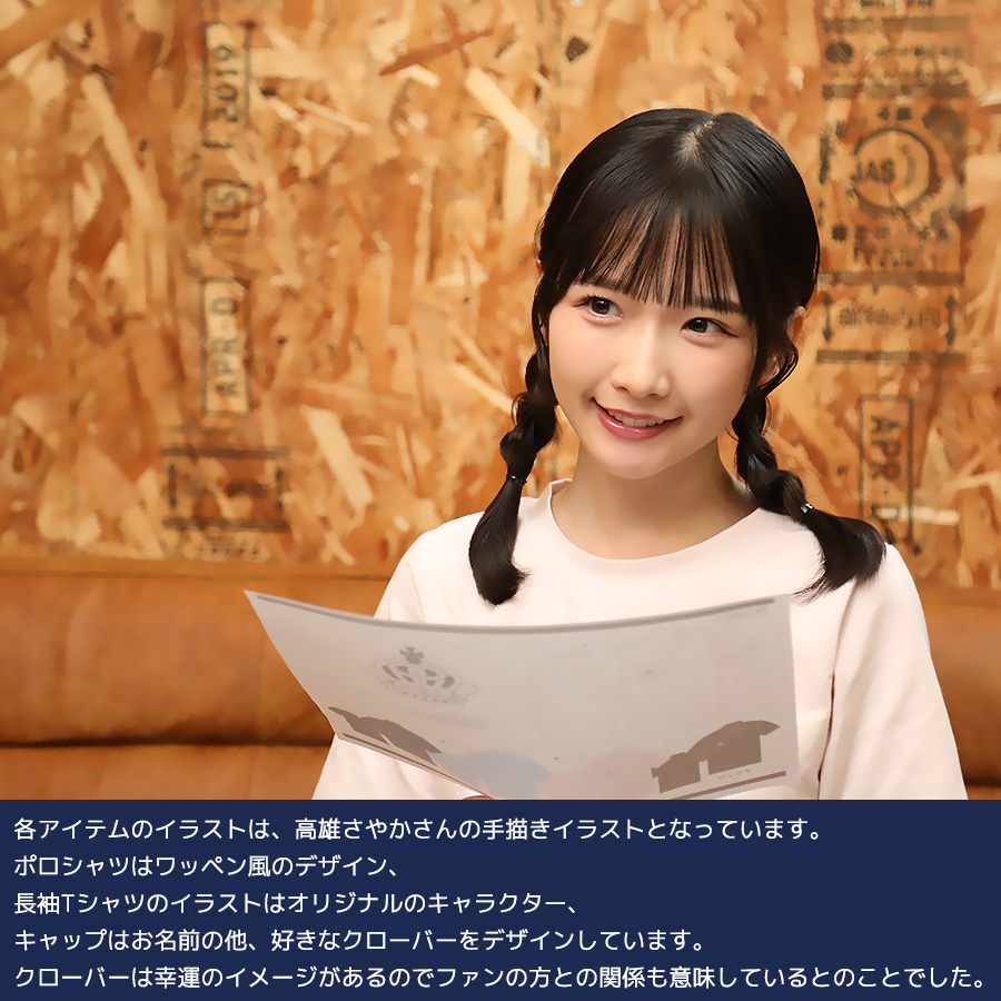 【ユニセックスサイズ】 ユニセックス:S■着丈67cm 身幅48cm 袖丈21cm 肩幅42cm ユニセックス:M■着丈71cm 身幅51cm 袖丈22cm 肩幅44cm ユニセックス:L■着丈75cm 身幅54cm 袖丈23cm 肩幅46cm ユニセックス:XL■着丈77cm 身幅57cm 袖丈24cm 肩幅48cm ユニセックス:XXL■着丈78cm 身幅60cm 袖丈24cm 肩幅50cm ★撮影時、高雄さやかさん着用サイズは WHITE,PINK【ユニセックス:S】サイズ BLACK,NAVY【ユニセックス:L】サイズ SAX【ユニセックス:XL】サイズです。 ★メンズモデル着用サイズは SAX【ユニセックス:M】サイズ WHITE,PINK,NAVY,BLACK【ユニセックス:L】サイズです。 メンズモデル身長: SAX,WHITE,NAVY,BLACK:177cm PINK:182cm ※メンズモデル着用画像はコンポジットイメージとなります。 【デザイン】 各アイテムのイラストは、高雄さやかさんの手描きイラストとなっています。 ポロシャツはワッペン風のデザイン、 長袖Tシャツのイラストはオリジナルのキャラクター、 キャップはお名前の他、好きなクローバーをデザインしています。 クローバーは幸運のイメージがあるのでファンの方との関係も意味しているとのことでした。 ここでしか手に入らない受注期間限定アイテムです!是非お買い求めください!!! ※商品の発送予定時期は 【11月中旬頃~11月下旬頃順次発送予定】となります。 ※受注生産の為、発送予定時期が前後する場合がございます。 ※高額注文の場合には ご注文後にお電話にてご連絡をさせていただく場合がございます。 お電話にてご連絡が取れない場合にはメールにてご連絡させていただき、 ご連絡日より3日以内にご返信をいただけない場合には不正注文の可能性があると判断し トラブル防止のためご注文をキャンセルとさせていただきます。 ※商品によっては撮影時にサンプルを使用しているため若干仕様が異なる場合がございます。 また、サイズ・カラーによっては仕様が異なる場合もございます。 ※手作業で縫製をしているため縫製の仕様により、 個体差が生じてしまいますので、1~2cm程度の誤差は予めご了承くださいませ。 ※洗濯機を使用した場合、お届け時のサイズより多少縮む場合がございます。 洗濯機を使用する場合は裏返してネットに入れることを推奨しております。 また、タンブラー乾燥機を使用しますとプリントが剥がれる恐れがありますので 避けていただきますようお願いいたします。 また、洗濯時の液温は40度以下とし、 塩素系および酸素系漂白剤の使用は避けていただきますようお願いいたします。 アイロンにつきましてもプリント及び刺繍部分は避け、 生地部分にアイロンをかける場合にはあて布をして110度(低温)にてお願いいたします。 ※また、受注生産とさせていただいておりますが、 各色・サイズ毎に生産数に限りがございます為、 生産数の上限に達しました場合在庫切れとなる場合がございます。 |