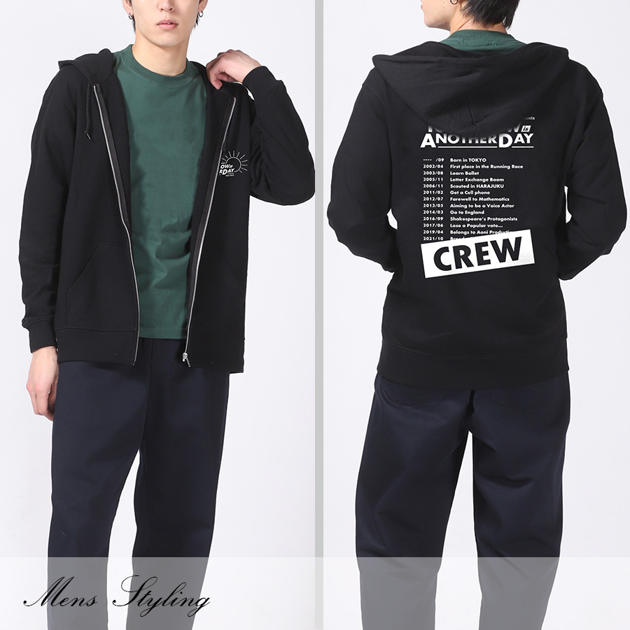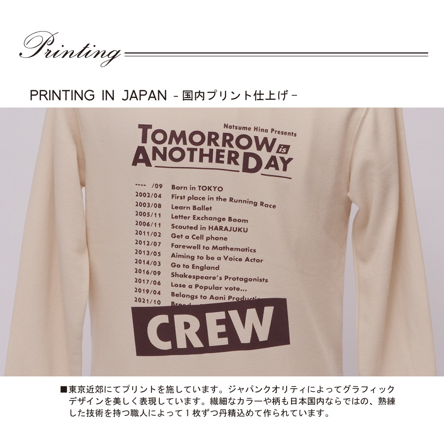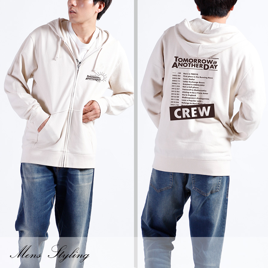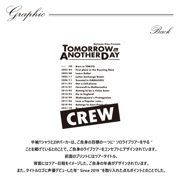 | 商品Data | 夏目妃菜さんとのコラボ企画! 今回のコラボは半袖Tシャツ、ZIPパーカー、キャップをリリース。 【デザイン】 半袖TシャツとZIPパーカーは、ご自身の目標の一つに" ソロライブツアーをやる " ことを掲げているとのことで、ご自身のライブツアーをコンセプトにデザインされています。 前面のプリントにはツアータイトル、 背面にはツアー日程をイメージした、ご自身の年表がデザインされています。 また、タイトルロゴに声優デビューした年" Since 2019 "を取り入れた点もポイントとのことでした。 CAPは、他アイテムがかっこいいデザインとなっているため、ユルユルしたデザインに仕上げています。 "なつめ"とご自身のお名前が大きく刺繍され、ご本人専用かのようにした点もポイントです。 ここでしか手に入らない受注期間限定アイテムです!是非お買い求めください!!!