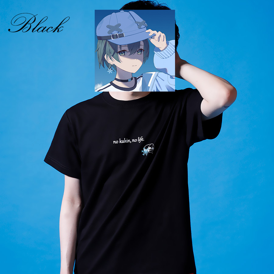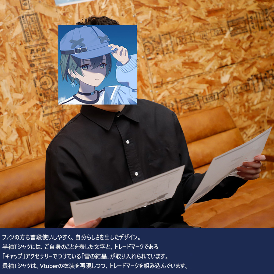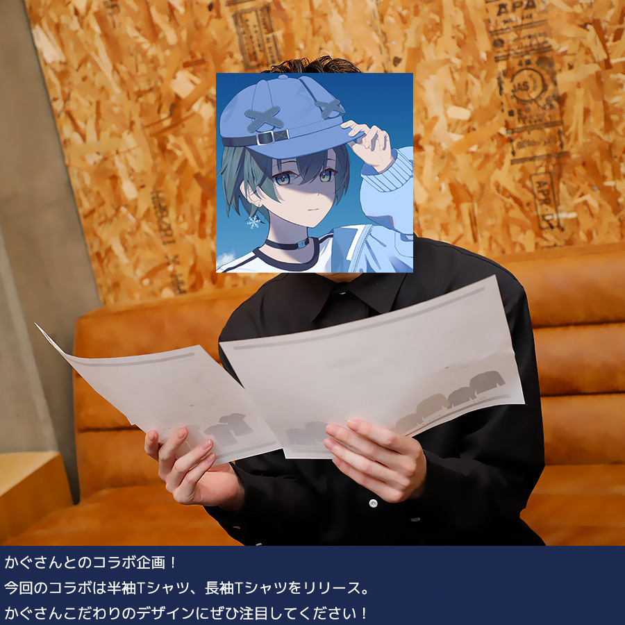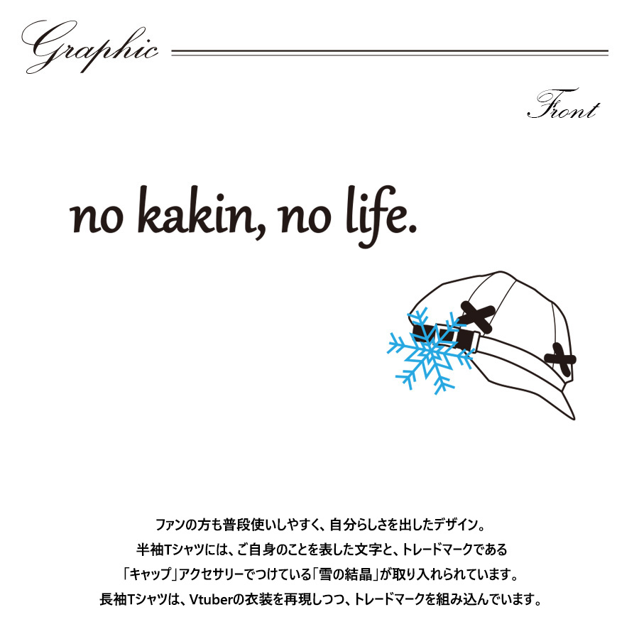 | 商品Data | かぐさんとのコラボ企画! 今回のコラボは半袖Tシャツ、長袖Tシャツをリリース。 【デザイン】 ファンの方も普段使いしやすく、自分らしさを出したデザイン。 半袖Tシャツには、ご自身のことを表した文字と、トレードマークである 「キャップ」アクセサリーでつけている「雪の結晶」が取り入れられています。 長袖Tシャツは、Vtuberの衣装を再現しつつ、トレードマークを組み込んでいます。 ここでしか手に入らない受注期間限定アイテムです!是非お買い求めください!!!