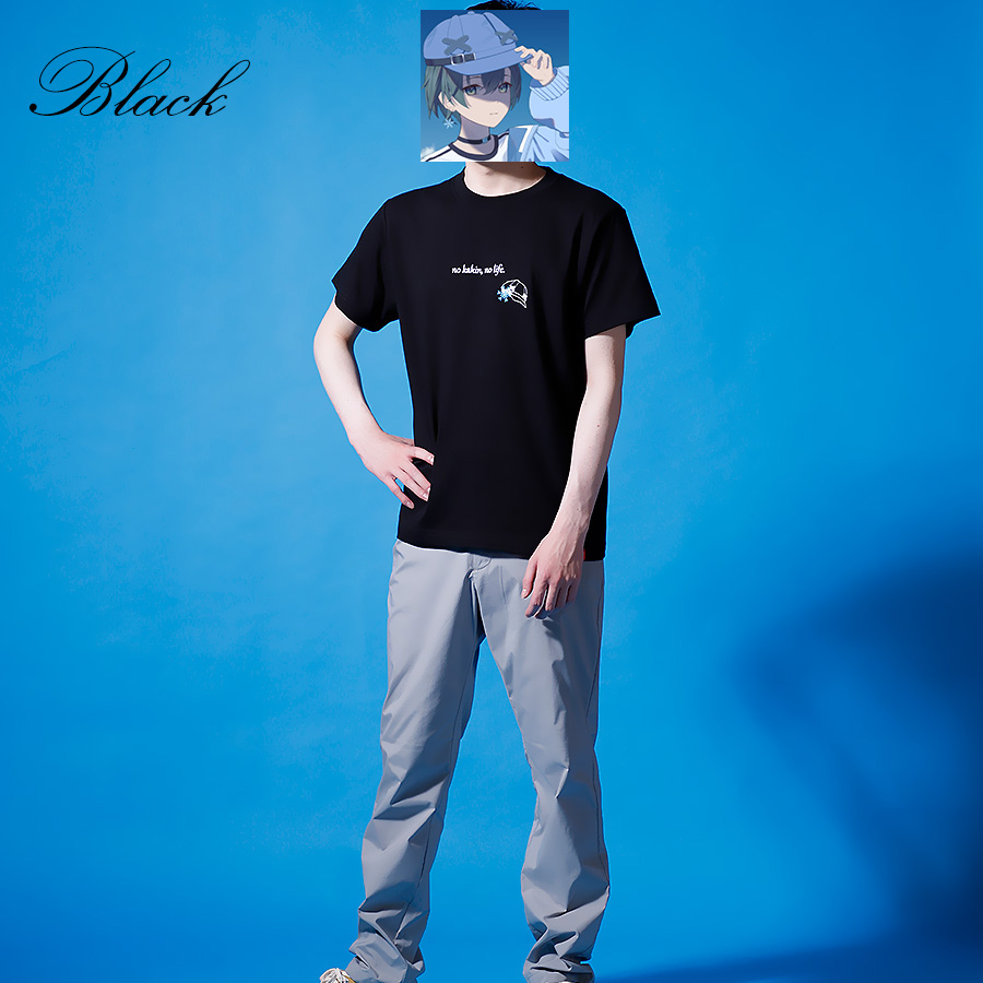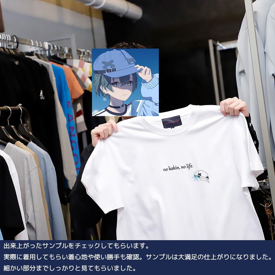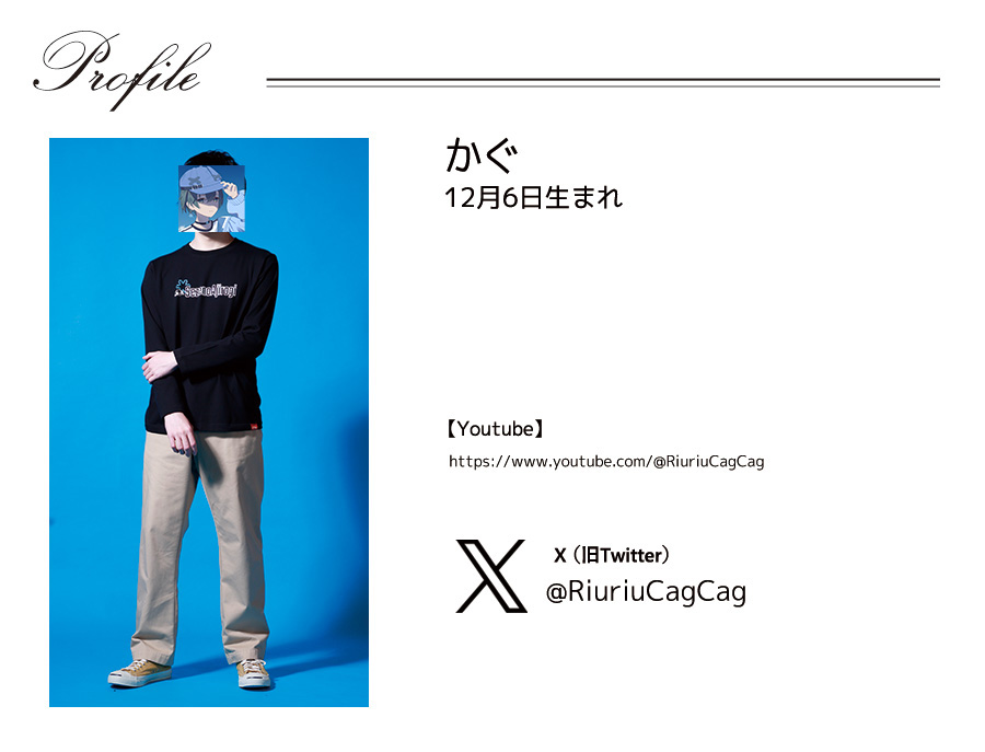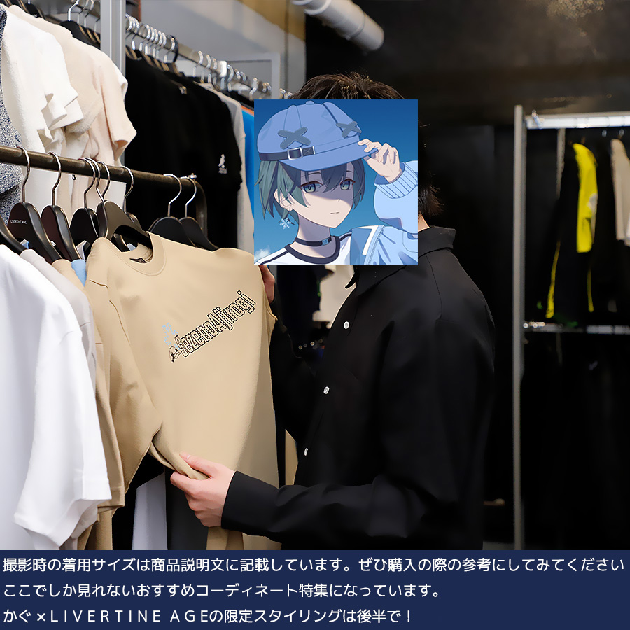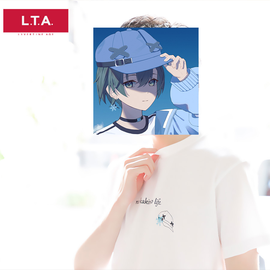 | 商品Data | かぐさんとのコラボ企画! 今回のコラボは半袖Tシャツ、長袖Tシャツをリリース。 【デザイン】 ファンの方も普段使いしやすく、自分らしさを出したデザイン。 半袖Tシャツには、ご自身のことを表した文字と、トレードマークである 「キャップ」アクセサリーでつけている「雪の結晶」が取り入れられています。 長袖Tシャツは、Vtuberの衣装を再現しつつ、トレードマークを組み込んでいます。 ここでしか手に入らない受注期間限定アイテムです!是非お買い求めください!!!