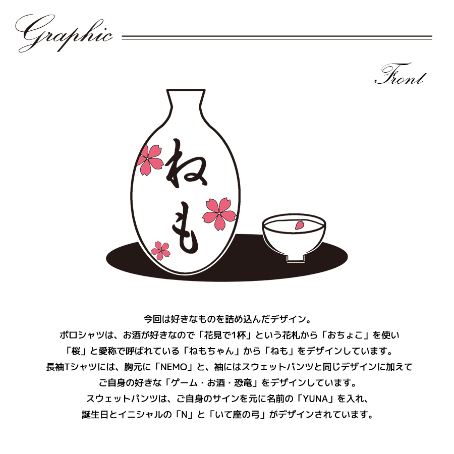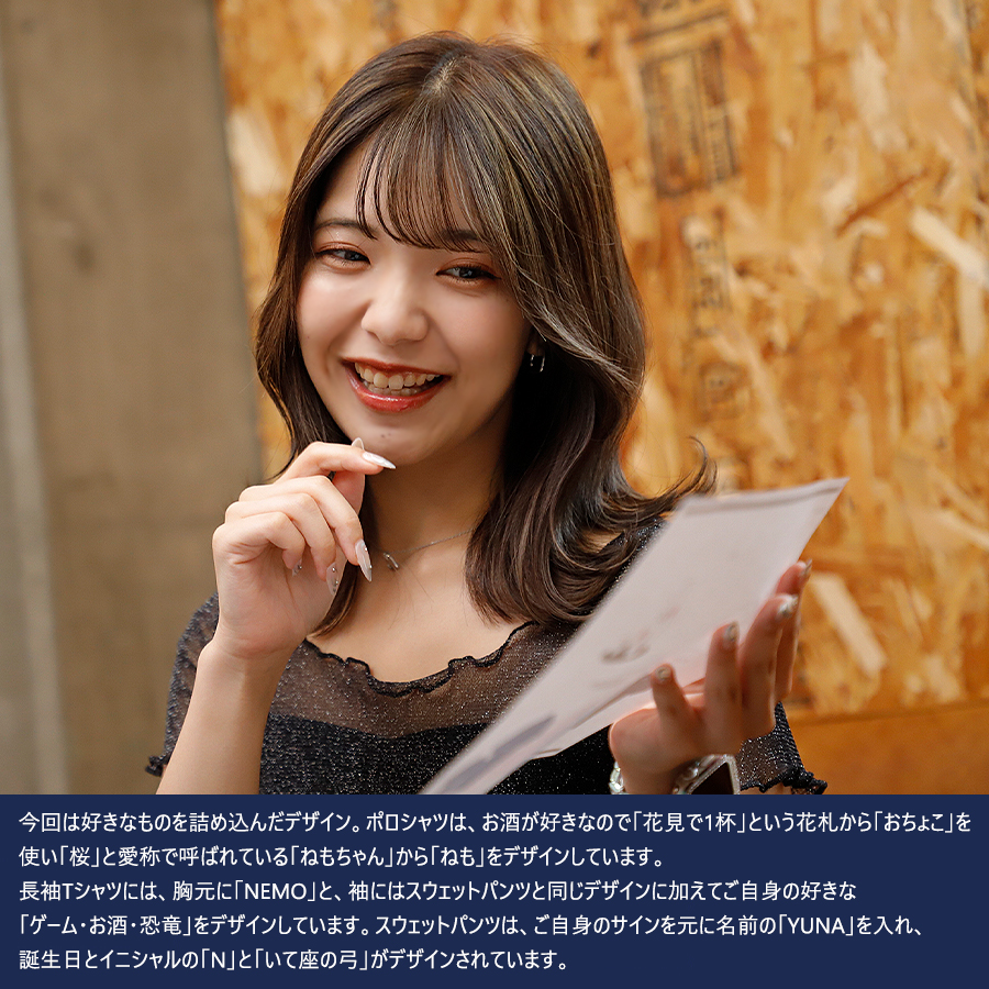 | 商品Data | 根本優奈さんとのコラボ企画第2弾! 今回のコラボは長袖Tシャツ、ポロシャツ、スウェットパンツをリリース。 【デザイン】 今回は好きなものを詰め込んだデザイン。 ポロシャツは、お酒が好きなので「花見で1杯」という花札から「おちょこ」を使い 「桜」と愛称で呼ばれている「ねもちゃん」から「ねも」をデザインしています。 長袖Tシャツには、胸元に「NEMO」と、袖にはスウェットパンツと同じデザインに加えて ご自身の好きな「ゲーム・お酒・恐竜」をデザインしています。 スウェットパンツは、ご自身のサインを元に名前の「YUNA」を入れ、 誕生日とイニシャルの「N」と「いて座の弓」がデザインされています。 ここでしか手に入らない受注期間限定アイテムです!是非お買い求めください!!! ※商品の発送予定時期は【10月下旬頃~11月上旬頃順次発送予定】となります。 ※受注生産の為、発送予定時期が前後する場合がございます。 ※高額注文の場合には ご注文後にお電話にてご連絡をさせていただく場合がございます。 お電話にてご連絡が取れない場合にはメールにてご連絡させていただき、 ご連絡日より3日以内にご返信をいただけない場合には不正注文の可能性があると判断し トラブル防止のためご注文をキャンセルとさせていただきます。 ※商品によっては撮影時にサンプルを使用しているため若干仕様が異なる場合がございます。 また、サイズ・カラーによっては仕様が異なる場合もございます。 ※手作業で縫製をしているため縫製の仕様により、 個体差が生じてしまいますので、1~2cm程度の誤差は予めご了承くださいませ。 ※洗濯機を使用した場合、お届け時のサイズより多少縮む場合がございます。 洗濯機を使用する場合は裏返してネットに入れることを推奨しております。 また、タンブラー乾燥機を使用しますとプリントが剥がれる恐れがありますので 避けていただきますようお願いいたします。 また、洗濯時の液温は40度以下とし、 塩素系および酸素系漂白剤の使用は避けていただきますようお願いいたします。 アイロンにつきましてもプリント及び刺繍部分は避け、 生地部分にアイロンをかける場合にはあて布をして110度(低温)にてお願いいたします。 ※また、受注生産とさせていただいておりますが、 各色・サイズ毎に生産数に限りがございます為、 生産数の上限に達しました場合在庫切れとなる場合がございます。 |