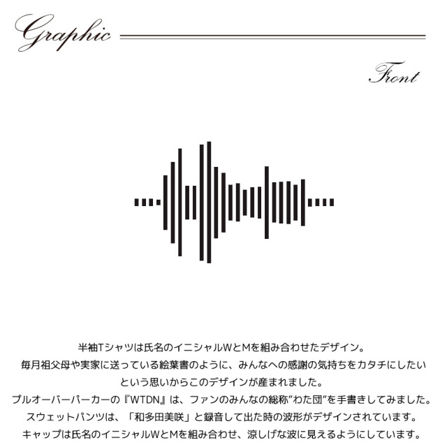 | 商品Data | 和多田美咲さんとのコラボ企画第3弾! 今回のコラボは半袖Tシャツ、プルオーバーパーカー、スウェットパンツ、キャップをリリース。 【デザイン】 半袖Tシャツは氏名のイニシャルWとMを組み合わせたデザイン。 毎月祖父母や実家に送っている絵葉書のように、みんなへの感謝の気持ちをカタチにしたいという思 いからこのデザインが産まれました。 プルオーバーパーカーの『WTDN』は、ファンのみんなの総称”わた団”を手書きしてみました。 スウェットパンツは、「和多田美咲」と録音して出た時の波形がデザインされています。 キャップは氏名のイニシャルWとMを組み合わせ、涼しげな波に見えるようにしています。 ここでしか手に入らない受注期間限定アイテムです!是非お買い求めください!!! ※商品の発送予定時期は 【11月中旬~11月下旬頃順次発送予定】 となります。 ※受注生産の為、発送予定時期が前後する場合がございます。 ※高額注文の場合には ご注文後にお電話にてご連絡をさせていただく場合がございます。 お電話にてご連絡が取れない場合にはメールにてご連絡させていただき、 ご連絡日より3日以内にご返信をいただけない場合には不正注文の可能性があると判断し トラブル防止のためご注文をキャンセルとさせていただきます。 ※商品によっては撮影時にサンプルを使用しているため若干仕様が異なる場合がございます。 また、サイズ・カラーによっては仕様が異なる場合もございます。 ※手作業で縫製をしているため縫製の仕様により、 個体差が生じてしまいますので、1~2cm程度の誤差は予めご了承くださいませ。 ※洗濯機を使用した場合、お届け時のサイズより多少縮む場合がございます。 洗濯機を使用する場合は裏返してネットに入れることを推奨しております。 また、タンブラー乾燥機を使用しますとプリントが剥がれる恐れがありますので 避けていただきますようお願いいたします。 また、洗濯時の液温は40度以下とし、 塩素系および酸素系漂白剤の使用は避けていただきますようお願いいたします。 アイロンにつきましてもプリント及び刺繍部分は避け、 生地部分にアイロンをかける場合にはあて布をして110度(低温)にてお願いいたします。 ※また、受注生産とさせていただいておりますが、 各色・サイズ毎に生産数に限りがございます為、 生産数の上限に達しました場合在庫切れとなる場合がございます。 |