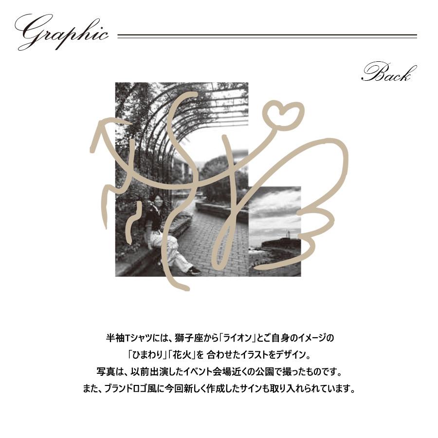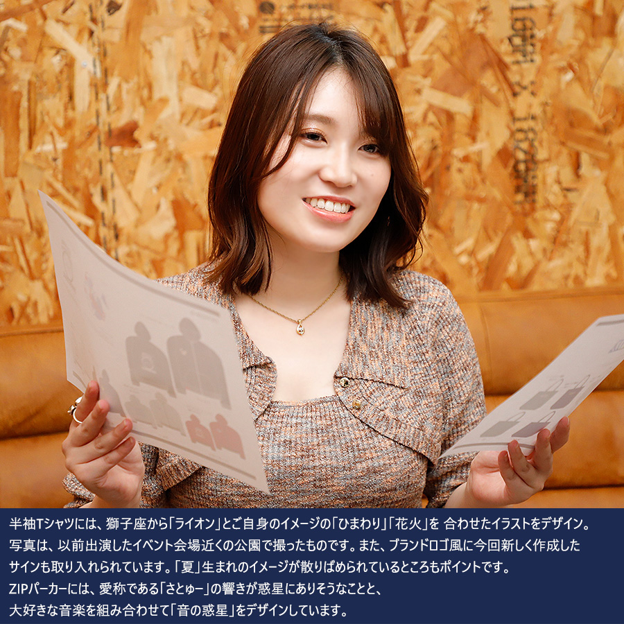 | 商品Data | 佐藤榛夏さんとのコラボ企画! 今回のコラボは半袖Tシャツ、ZIPパーカー、キャップ、トートバッグ をリリース。 【デザイン】 半袖Tシャツには、獅子座から「ライオン」とご自身のイメージの 「ひまわり」「花火」を 合わせたイラストをデザイン。 写真は、以前出演したイベント会場近くの公園で撮ったものです。 また、ブランドロゴ風に今回新しく作成したサインも取り入れられています。 「夏」生まれのイメージが散りばめられているところもポイントです。 ZIPパーカーには、愛称である「さとゅー」の響きが惑星にありそうなことと、 大好きな音楽を組み合わせて「音の惑星」をデザインしています。 ここでしか手に入らない受注期間限定アイテムです!是非お買い求めください!!!