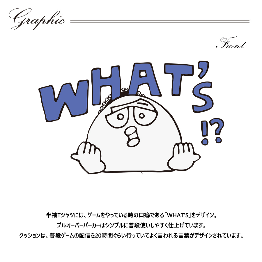 | 商品Data | まつりさんとのコラボ企画! 今回のコラボは半袖Tシャツ、プルオーバーパーカー、クッションをリリース。 【デザイン】 半袖Tシャツには、ゲームをやっている時の口癖である「WHAT'S」をデザイン。 プルオーバーパーカーはシンプルに普段使いしやすく仕上げています。 クッションは、普段ゲームの配信を20時間ぐらい行っていて よく言われる言葉がデザインされています。 ここでしか手に入らない受注期間限定アイテムです!是非お買い求めください!!! ※商品の発送予定時期は 【11月下旬頃~12月上旬頃順次発送予定】 となります。 ※受注生産の為、発送予定時期が前後する場合がございます。 ※高額注文の場合には ご注文後にお電話にてご連絡をさせていただく場合がございます。 お電話にてご連絡が取れない場合にはメールにてご連絡させていただき、 ご連絡日より3日以内にご返信をいただけない場合には不正注文の可能性があると判断し トラブル防止のためご注文をキャンセルとさせていただきます。 ※商品によっては撮影時にサンプルを使用しているため若干仕様が異なる場合がございます。 また、サイズ・カラーによっては仕様が異なる場合もございます。 ※手作業で縫製をしているため縫製の仕様により、 個体差が生じてしまいますので、1~2cm程度の誤差は予めご了承くださいませ。 ※洗濯機を使用した場合、お届け時のサイズより多少縮む場合がございます。 洗濯機を使用する場合は裏返してネットに入れることを推奨しております。 また、タンブラー乾燥機を使用しますとプリントが剥がれる恐れがありますので 避けていただきますようお願いいたします。 また、洗濯時の液温は40度以下とし、 塩素系および酸素系漂白剤の使用は避けていただきますようお願いいたします。 アイロンにつきましてもプリント及び刺繍部分は避け、 生地部分にアイロンをかける場合にはあて布をして110度(低温)にてお願いいたします。 ※また、受注生産とさせていただいておりますが、 各色・サイズ毎に生産数に限りがございます為、 生産数の上限に達しました場合在庫切れとなる場合がございます。 |