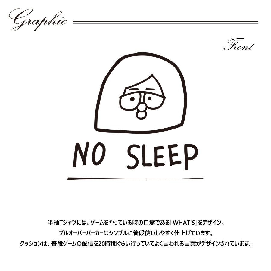 まつりさんとのコラボ企画! 今回のコラボは半袖Tシャツ、プルオーバーパーカー、クッションをリリース。 【デザイン】 半袖Tシャツには、ゲームをやっている時の口癖である「WHAT'S」をデザイン。 プルオーバーパーカーはシンプルに普段使いしやすく仕上げています。 クッションは、普段ゲームの配信を20時間ぐらい行っていて よく言われる言葉がデザインされています。 ここでしか手に入らない受注期間限定アイテムです!是非お買い求めください!!! ※商品の発送予定時期は 【11月下旬頃~12月上旬頃順次発送予定】 となります。 ※受注生産の為、発送予定時期が前後する場合がございます。 ※高額注文の場合にはご注文後にお電話にてご連絡をさせていただく場合がございます。 お電話にてご連絡が取れない場合にはメールにてご連絡させていただき、 ご連絡日より3日以内にご返信をいただけない場合には不正注文の可能性があると判断し トラブル防止のためご注文をキャンセルとさせていただきます。 ※商品によっては撮影時にサンプルを使用しているため若干デザインや仕様が異なる場合がございます。 また、サイズ・カラーによっては仕様が異なる場合もございます。 ※手作業で縫製をしているため縫製の仕様により、 個体差が生じてしまいますので、1~2cm程度の誤差は予めご了承くださいませ。 ※洗濯機を使用した場合、お届け時のサイズより多少縮む場合がございます。 洗濯機を使用する場合は裏返してネットに入れることを推奨しております。 また、タンブラー乾燥機を使用しますとプリントが剥がれる恐れがありますので 避けていただきますようお願いいたします。 また、洗濯時の液温は40度以下とし、 塩素系および酸素系漂白剤の使用は避けていただきますようお願いいたします。 アイロンにつきましてもプリント及び刺繍部分は避け、 生地部分にアイロンをかける場合にはあて布をして110度(低温)にてお願いいたします。 ※また、受注生産とさせていただいておりますが、 各色・サイズ毎に生産数に限りがございます為、 生産数の上限に達しました場合在庫切れとなる場合がございます。 |