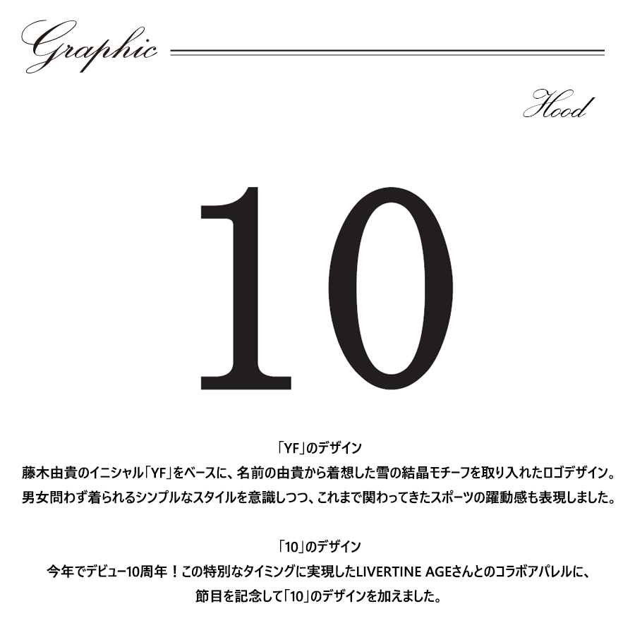 | 商品Data | 藤木由貴さんとのコラボ企画! 今回のコラボは半袖Tシャツ、プルオーバーパーカー、キャップをリリース。 【デザイン】 「YF」のデザイン 藤木由貴のイニシャル「YF」をベースに、名前の由貴から着想した雪の結晶モチーフを取り入れた ロゴデザイン。 男女問わず着られるシンプルなスタイルを意識しつつ、これまで関わってきたスポーツの躍動感も 表現しました。 「10」のデザイン 今年でデビュー10周年!この特別なタイミングに実現したLIVERTINE AGEさんとのコラボアパレ ルに、節目を記念して「10」のデザインを加えました。 ここでしか手に入らない受注期間限定アイテムです!是非お買い求めください!!! ※商品の発送予定時期は【12月中旬頃~12月下旬頃順次発送予定】 となります。 ※受注生産の為、発送予定時期が前後する場合がございます。 ※高額注文の場合には ご注文後にお電話にてご連絡をさせていただく場合がございます。 お電話にてご連絡が取れない場合にはメールにてご連絡させていただき、 ご連絡日より3日以内にご返信をいただけない場合には不正注文の可能性があると判断し トラブル防止のためご注文をキャンセルとさせていただきます。 ※商品によっては撮影時にサンプルを使用しているため若干仕様が異なる場合がございます。 また、サイズ・カラーによっては仕様が異なる場合もございます。 ※手作業で縫製をしているため縫製の仕様により、 個体差が生じてしまいますので、1~2cm程度の誤差は予めご了承くださいませ。 ※洗濯機を使用した場合、お届け時のサイズより多少縮む場合がございます。 洗濯機を使用する場合は裏返してネットに入れることを推奨しております。 また、タンブラー乾燥機を使用しますとプリントが剥がれる恐れがありますので 避けていただきますようお願いいたします。 また、洗濯時の液温は40度以下とし、 塩素系および酸素系漂白剤の使用は避けていただきますようお願いいたします。 アイロンにつきましてもプリント及び刺繍部分は避け、 生地部分にアイロンをかける場合にはあて布をして110度(低温)にてお願いいたします。 ※また、受注生産とさせていただいておりますが、 各色・サイズ毎に生産数に限りがございます為、 生産数の上限に達しました場合在庫切れとなる場合がございます。 |