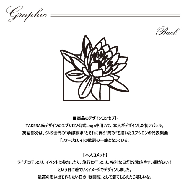 ※メンズ・レディースモデル着用画像はコンポジットイメージとなります。 ユプシロンさんとのコラボ企画! 今回のコラボはナイロンコーチジャケット、ZIPパーカー、バケットハットをリリース。 【デザイン】 TAKEBA氏デザインのユプシロン公式Logoを用いて、本人がデザインした初アパレル。 英語部分は、SNS世代の“承認欲求”とそれに伴う“痛み”を描いたユプシロンの代表楽曲 「フォージェリィ」の歌詞の一節となっている。 【本人コメント】 ライブに行ったり、イベントに参加したり、旅行に行ったり。特別な日だけど動きやすい 服がいい!という日に着ていくイメージでデザインしました。最高の思い出を作りたい日 の「戦闘服」として着てもらえたら嬉しいな。 ここでしか手に入らない受注期間限定アイテムです!是非お買い求めください!!! ※商品の発送予定時期は 【12月上旬頃~12月中旬頃順次発送予定】となります。 ※受注生産の為、発送予定時期が前後する場合がございます。 ※高額注文の場合には ご注文後にお電話にてご連絡をさせていただく場合がございます。 お電話にてご連絡が取れない場合にはメールにてご連絡させていただき、 ご連絡日より3日以内にご返信をいただけない場合には不正注文の可能性があると判断し トラブル防止のためご注文をキャンセルとさせていただきます。 ※商品によっては撮影時にサンプルを使用しているため若干仕様が異なる場合がございます。 また、サイズ・カラーによっては仕様が異なる場合もございます。 ※手作業で縫製をしているため縫製の仕様により、 個体差が生じてしまいますので、1~2cm程度の誤差は予めご了承くださいませ。 ※洗濯機を使用した場合、お届け時のサイズより多少縮む場合がございます。 洗濯機を使用する場合は裏返してネットに入れることを推奨しております。 また、タンブラー乾燥機を使用しますとプリントが剥がれる恐れがありますので 避けていただきますようお願いいたします。 また、洗濯時の液温は40度以下とし、 塩素系および酸素系漂白剤の使用は避けていただきますようお願いいたします。 アイロンにつきましてもプリント及び刺繍部分は避け、 生地部分にアイロンをかける場合にはあて布をして110度(低温)にてお願いいたします。 ※また、受注生産とさせていただいておりますが、 各色・サイズ毎に生産数に限りがございます為、 生産数の上限に達しました場合在庫切れとなる場合がございます。 |